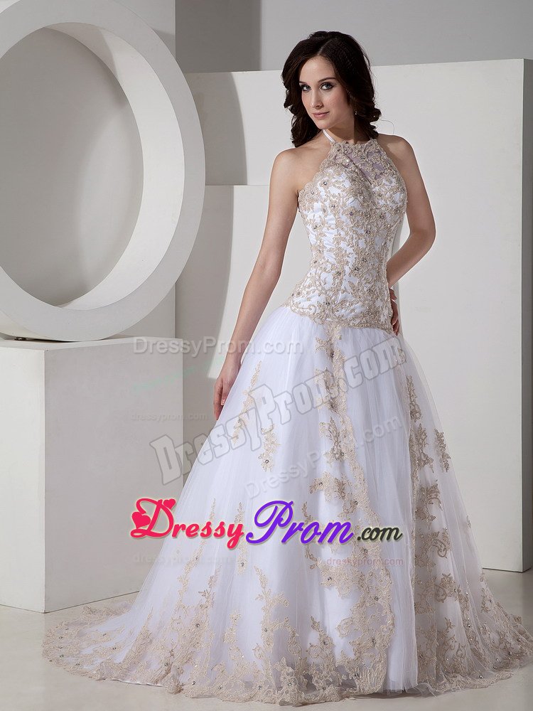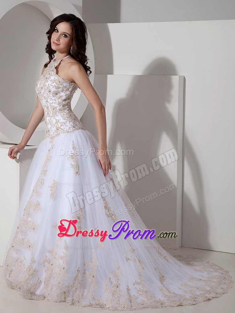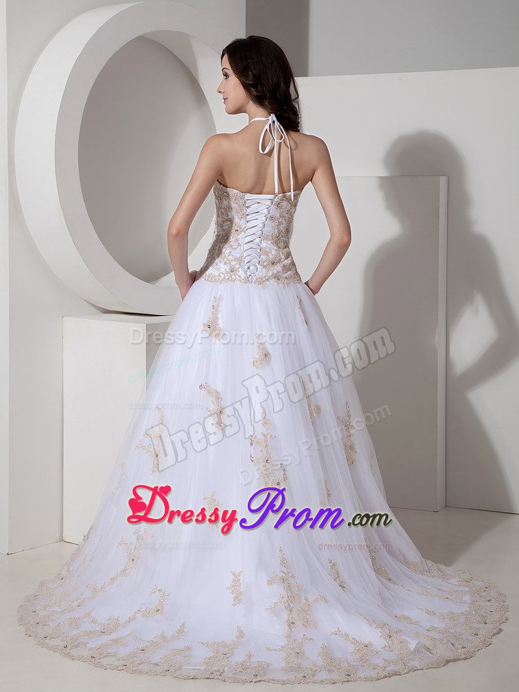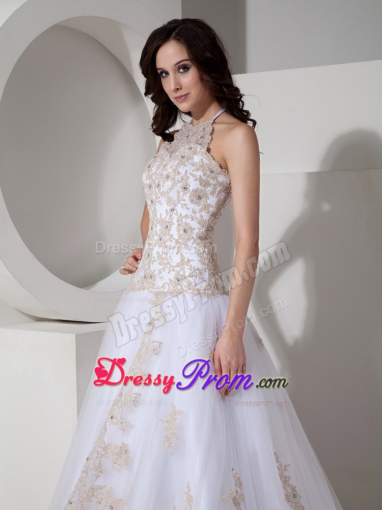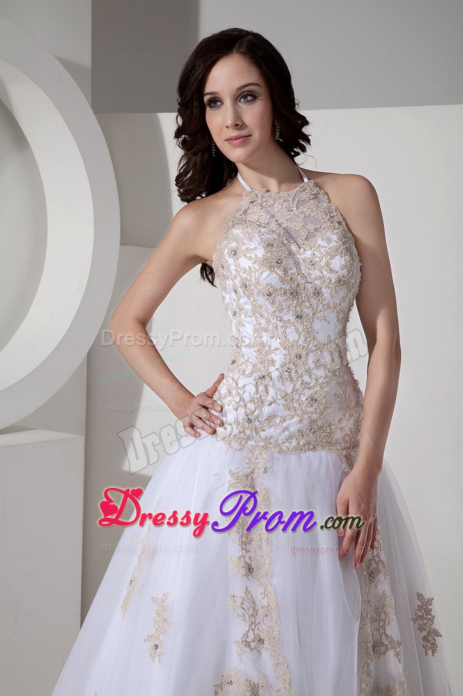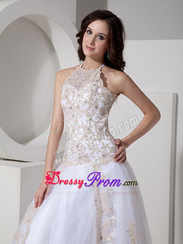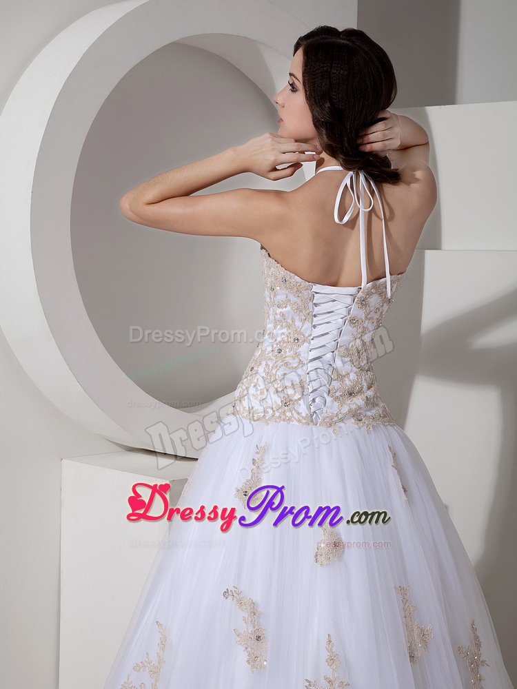 This versatile little dress would be great for a variety of functions � from weddings to church to formal dinners. It features a halter-top neckline and a lovely beaded lace overlay bodice. The floor-length skirt is perfect for both style and comfort. A lace up back makes for easy off and on with a train secures the dress in place. So pretty, so versatile! Silhouette: Ball Gown