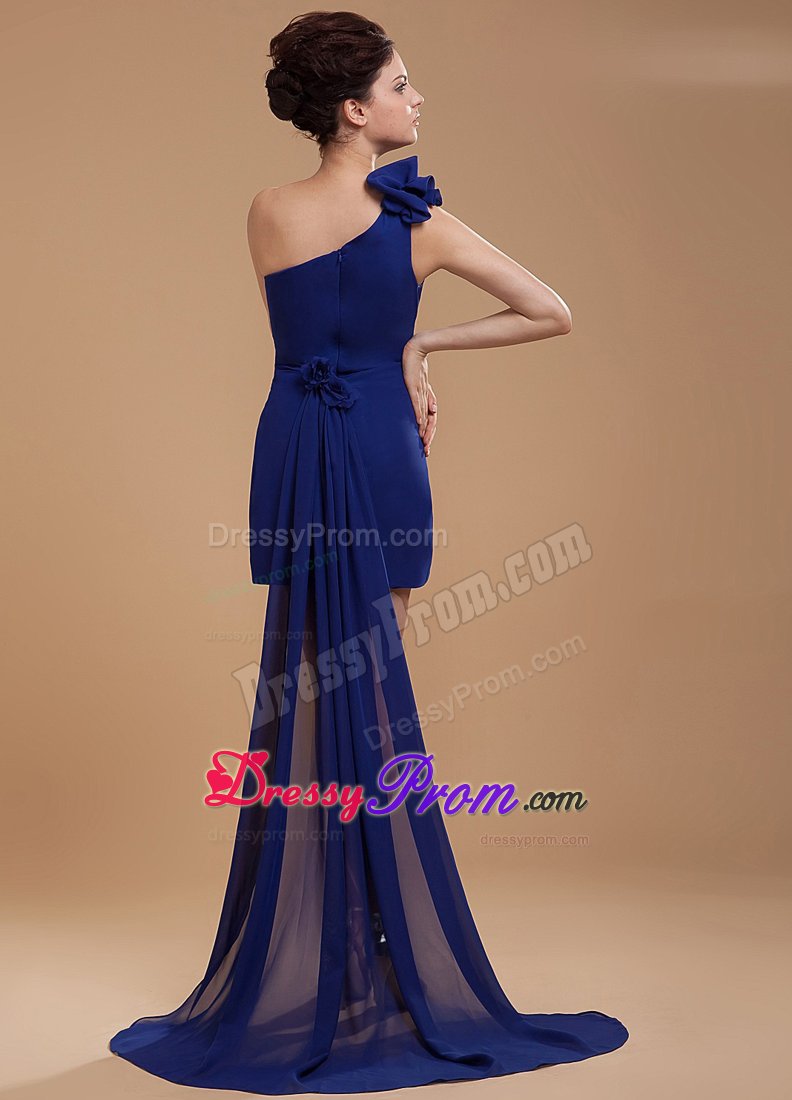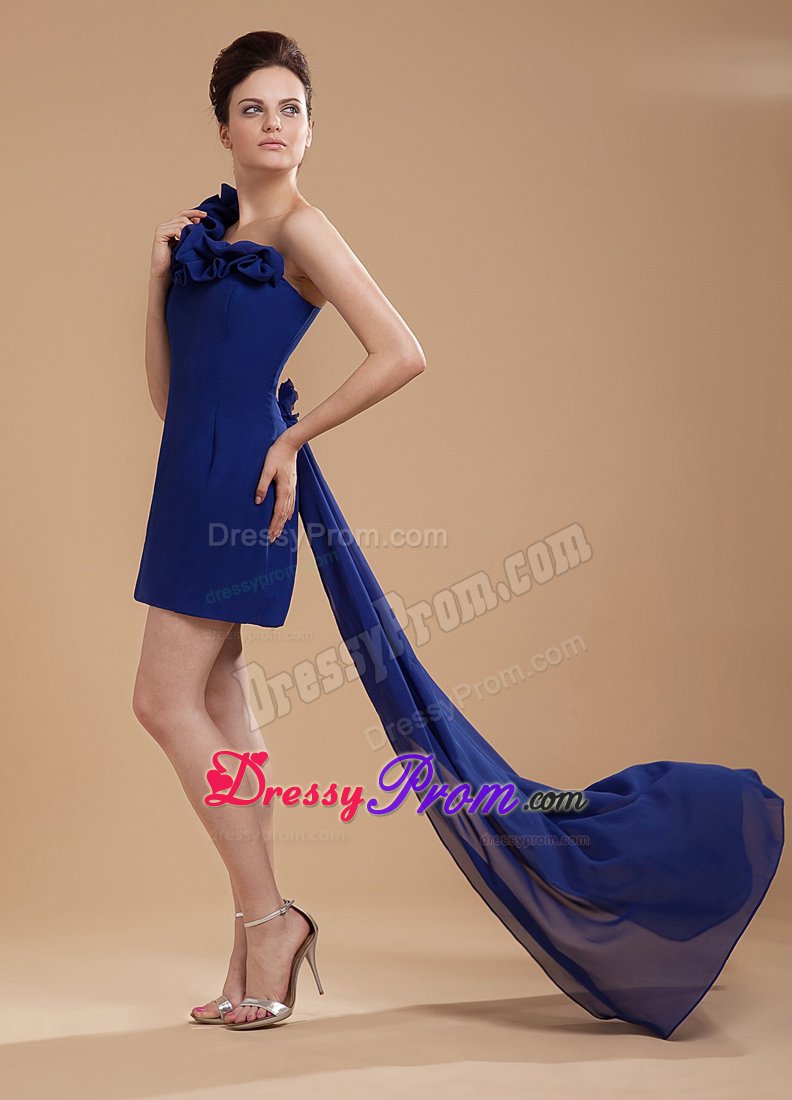 This royal blue dress features one shoulder strap which is decorated with hand made flowers. The mini length skirt will show your sexy legs and wonderful shoes. The hidden zipper on the back makes for easy off and on and secures the dress in place. At the waist part, a hand made flower decorated and extends to the floor to be a watteau train. A quite special dress for any party!