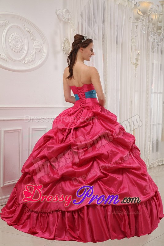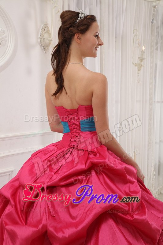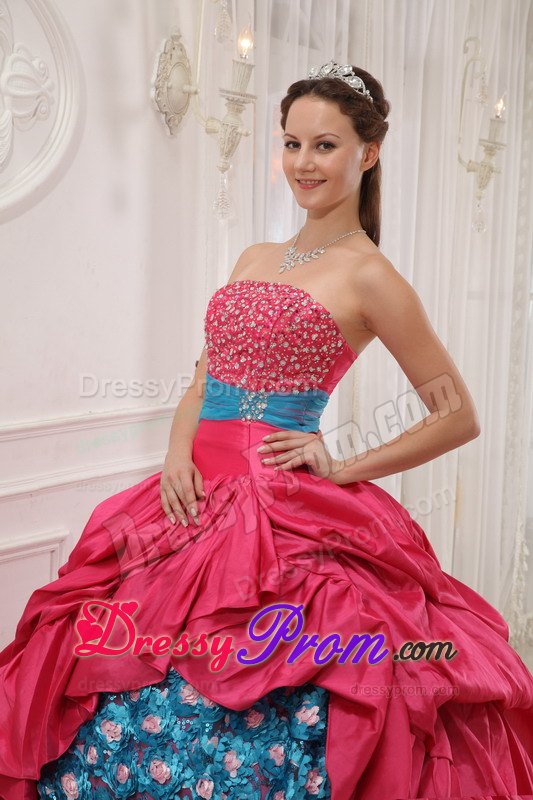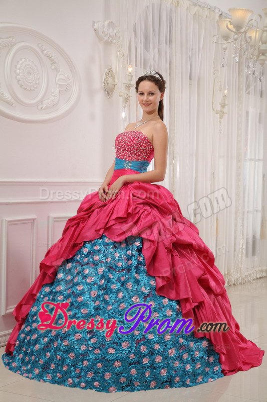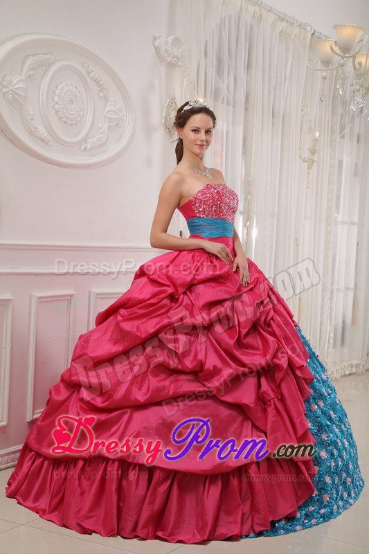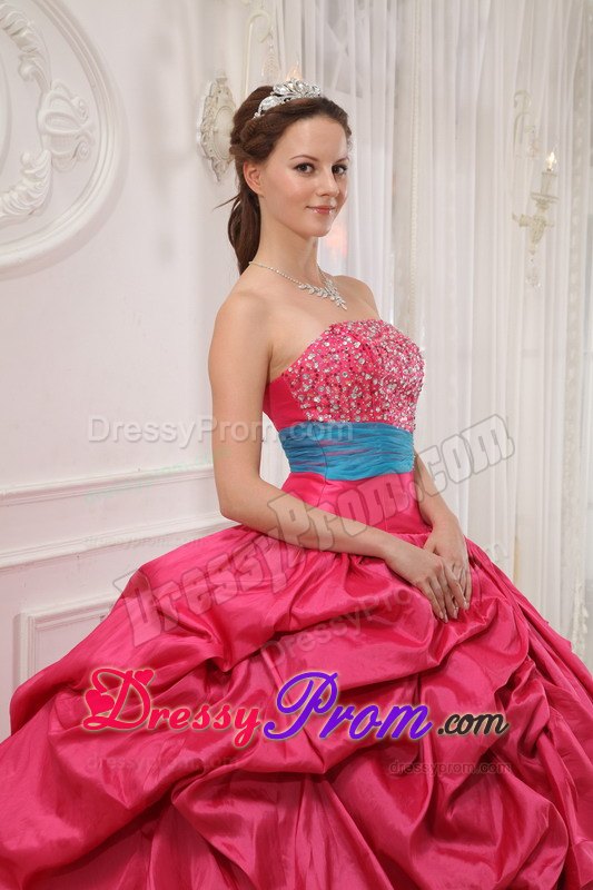 This quinceanera dress is amazing! It has so many design elements that we don't even know where to begin describing it! It has a strapless and a shinny beading bodice accented with a wonderful ruched waistband. The outer part of the skirt is made from many, many yards of ruched material that create an absolutely beautiful effect in the skirt. A lace up corset style closure in the back secures the dress in place.The most excellent part is the inner part of the skirt, which is so fantastic with the exquisite appliques. What a perfect gown for you.