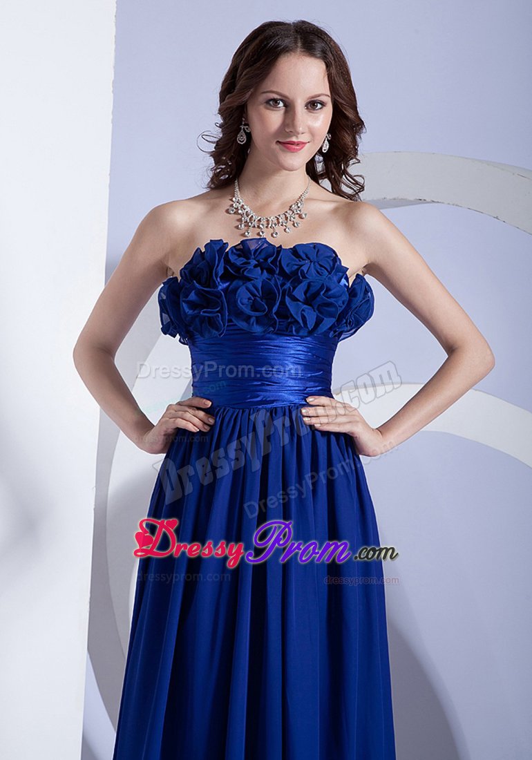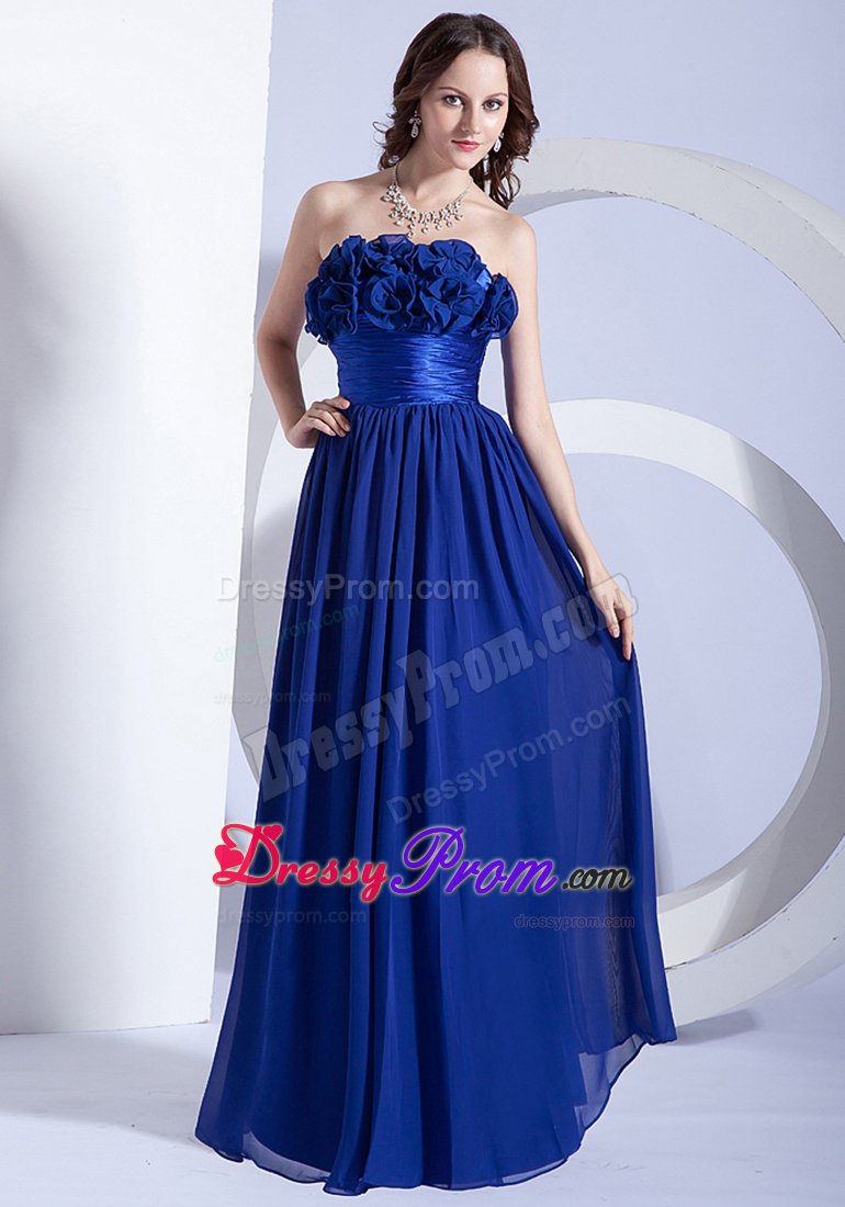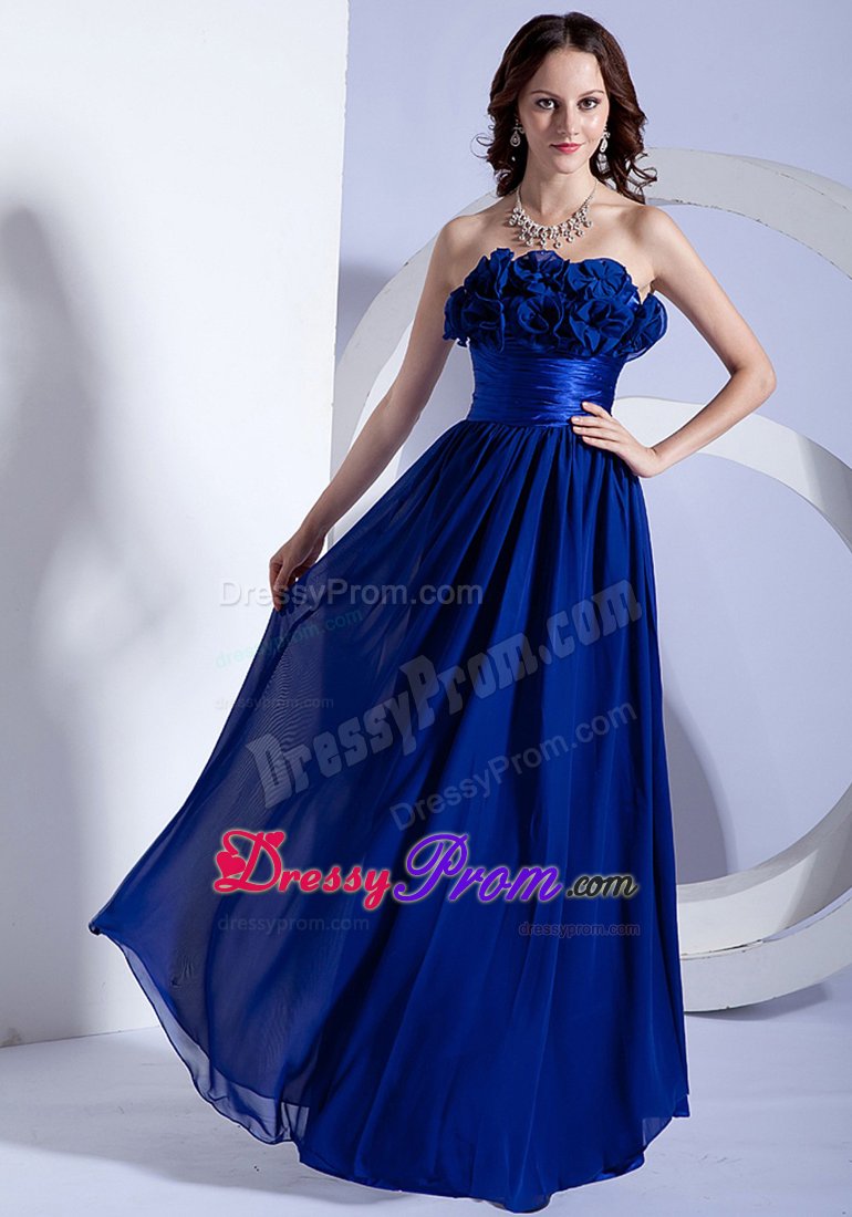 A stunning fit-and-flare silhouette tailored to figure-flattering perfection in a gorgeous style. Crafted with a strapless neckline and hand made flower adorned bodice, it's the perfect blend of romantic and refined. A wide waistband contours your figure rightly well.The flowy skirt with pleated adornments on it makes it so lovely. The corset style bodice is finished with a zipper.