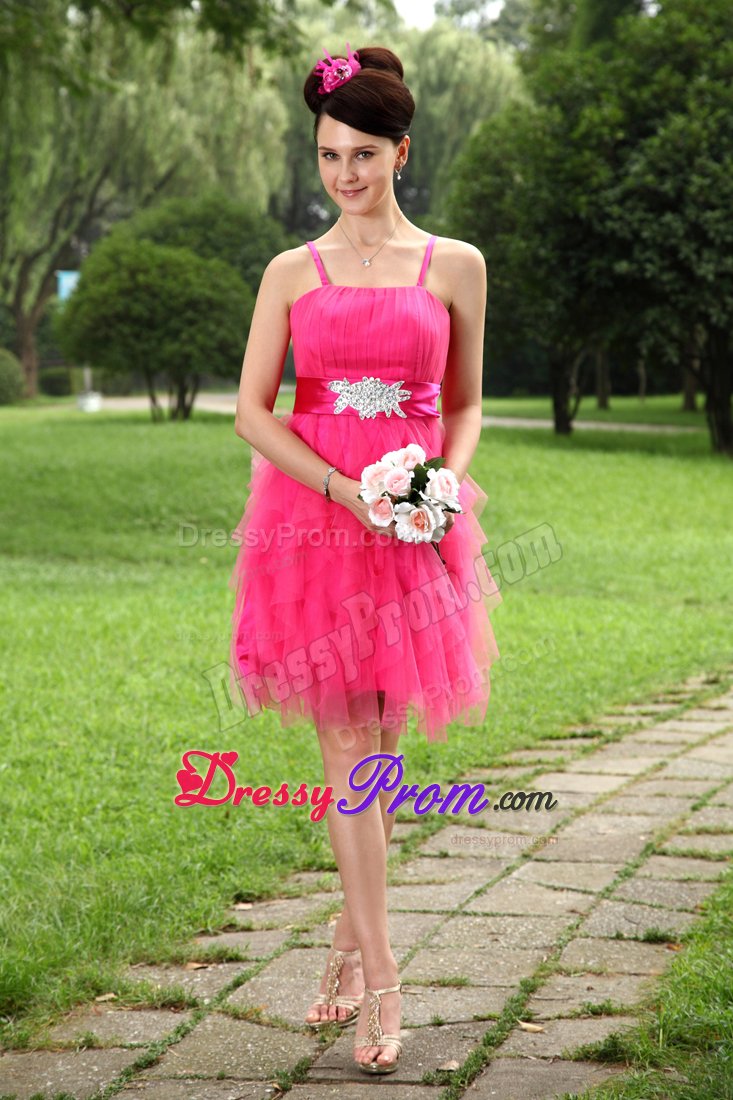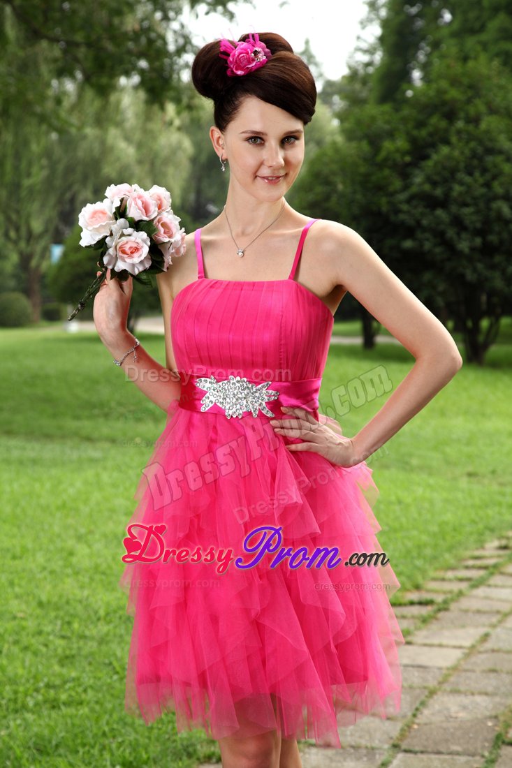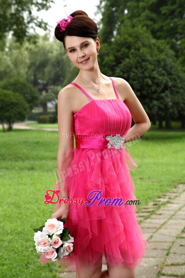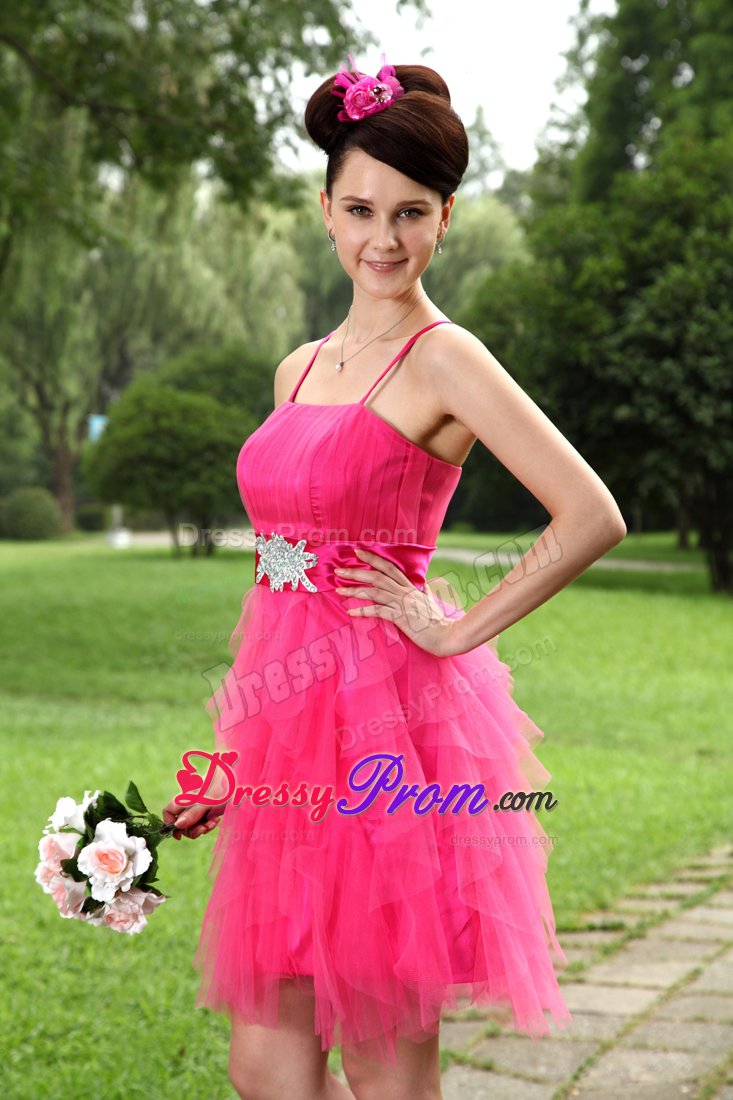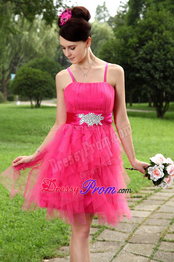 Short dress with more ornate designs are becoming more popular. This one is a gorgeous example of what we mean! The pleated bodice features two spaghetti straps and a straight neckline to flatter your figure. A solid color satin waistband is ornamented with a beaded and studded brooch for accent. The mini-length skirt is shapely made from many sheer layers of playful tulle overlayed which adds to its overal fullness. A hidden zipper makes for easy off and on and secures the dress in place. Such a sweet dress, why not choose it?
