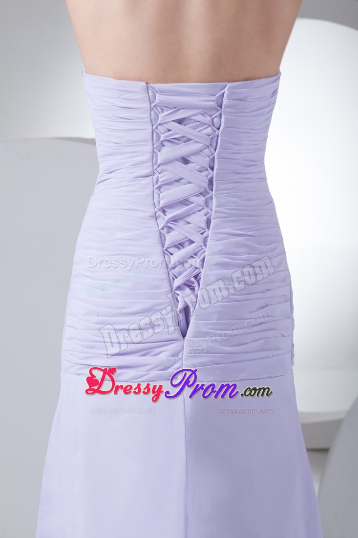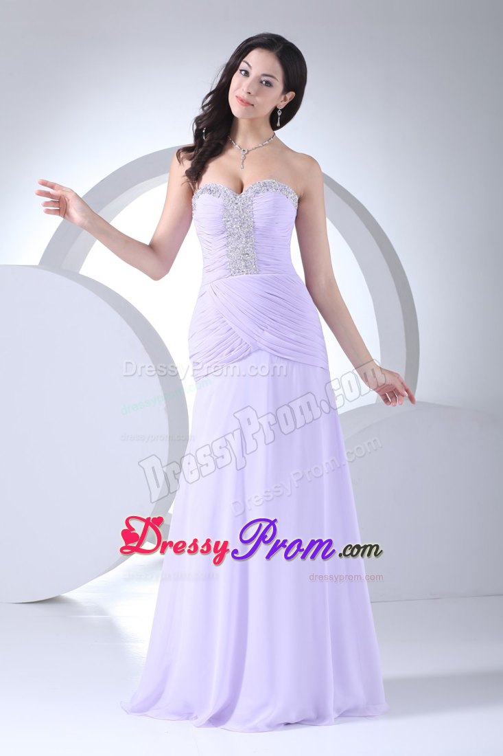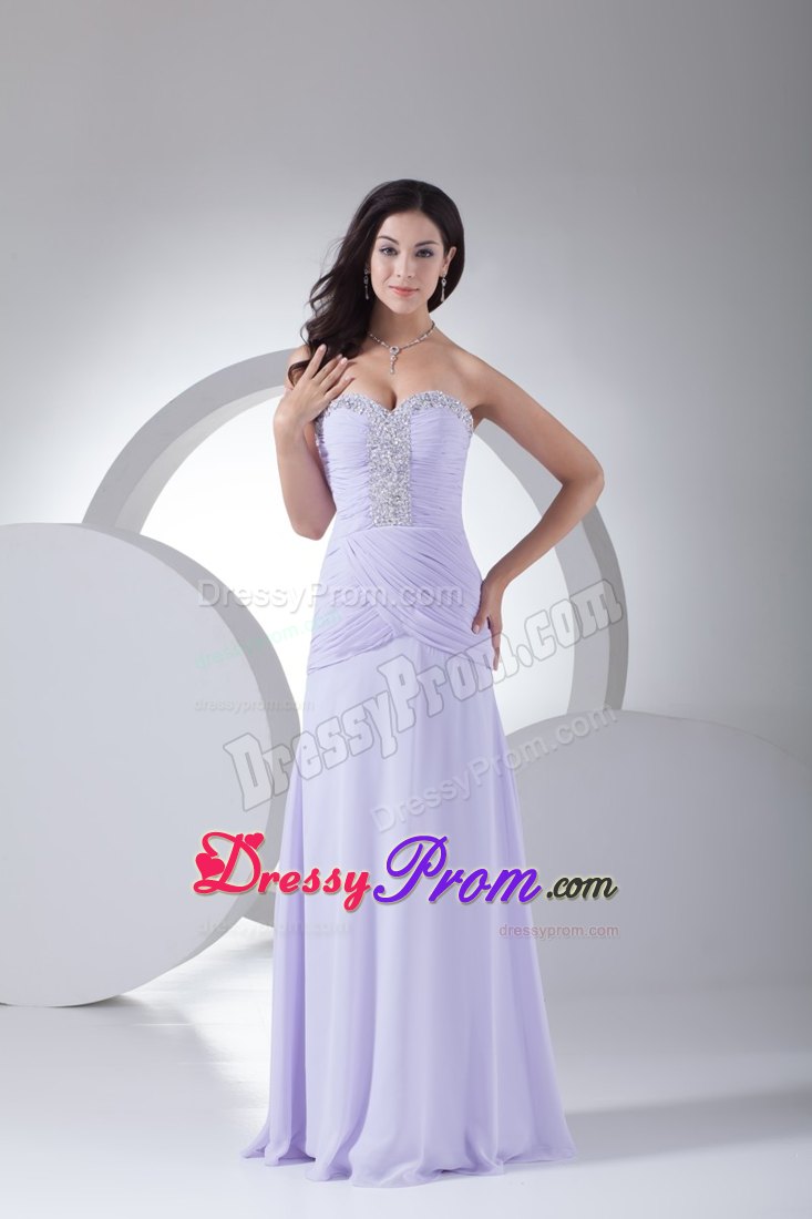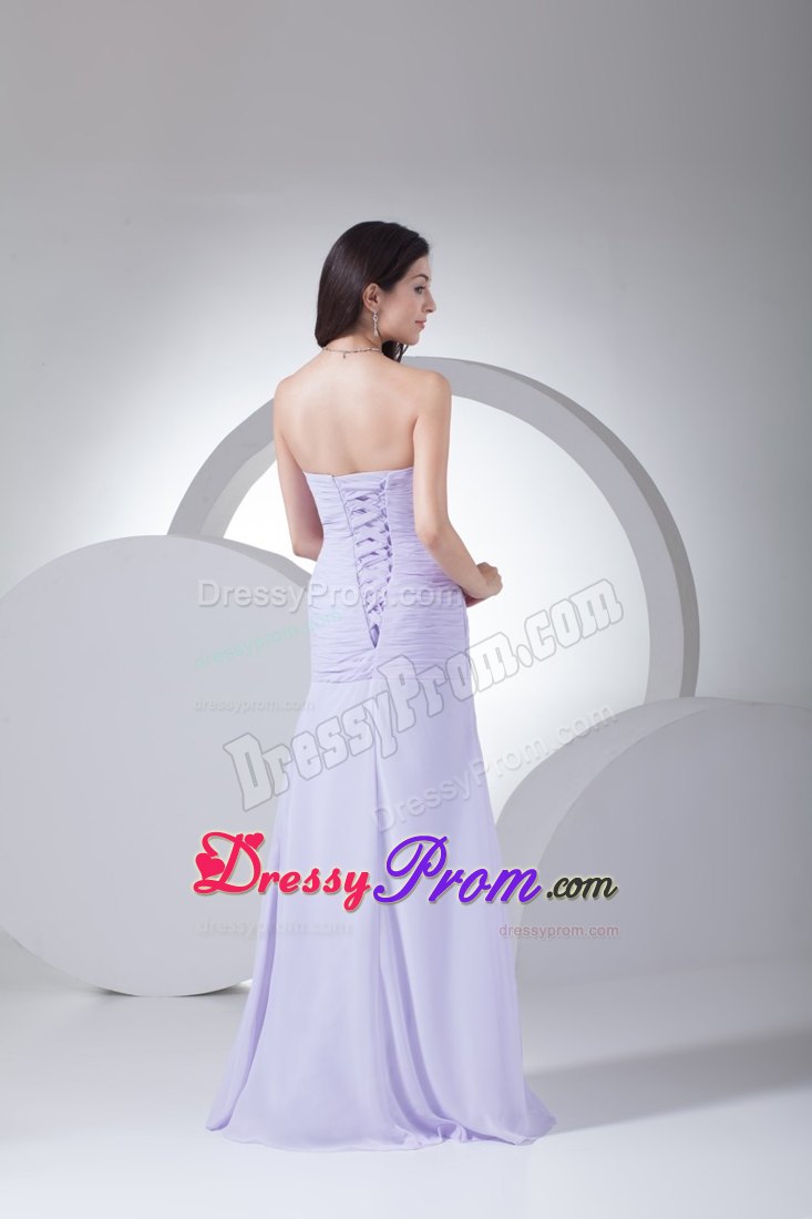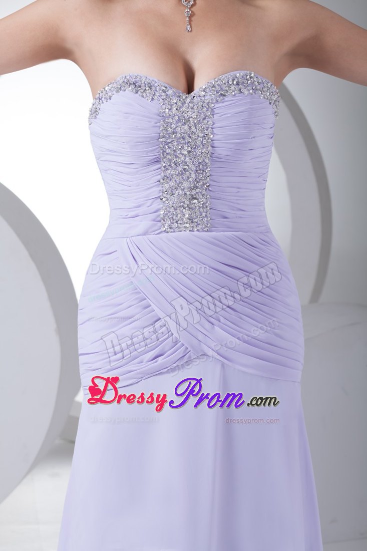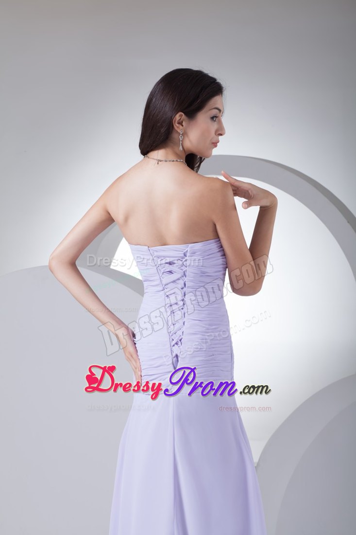 This gorgeous lilac prom dress will put you to mind of a traditional southern belle! A beaded sweetheart neckline and ruching are adorned with fitted bodice. The vertical beading lines embellish the beautiful top. The dropped waist will never hide your good figure. A lace up closure makes for easy off and on and secures the dress in place.