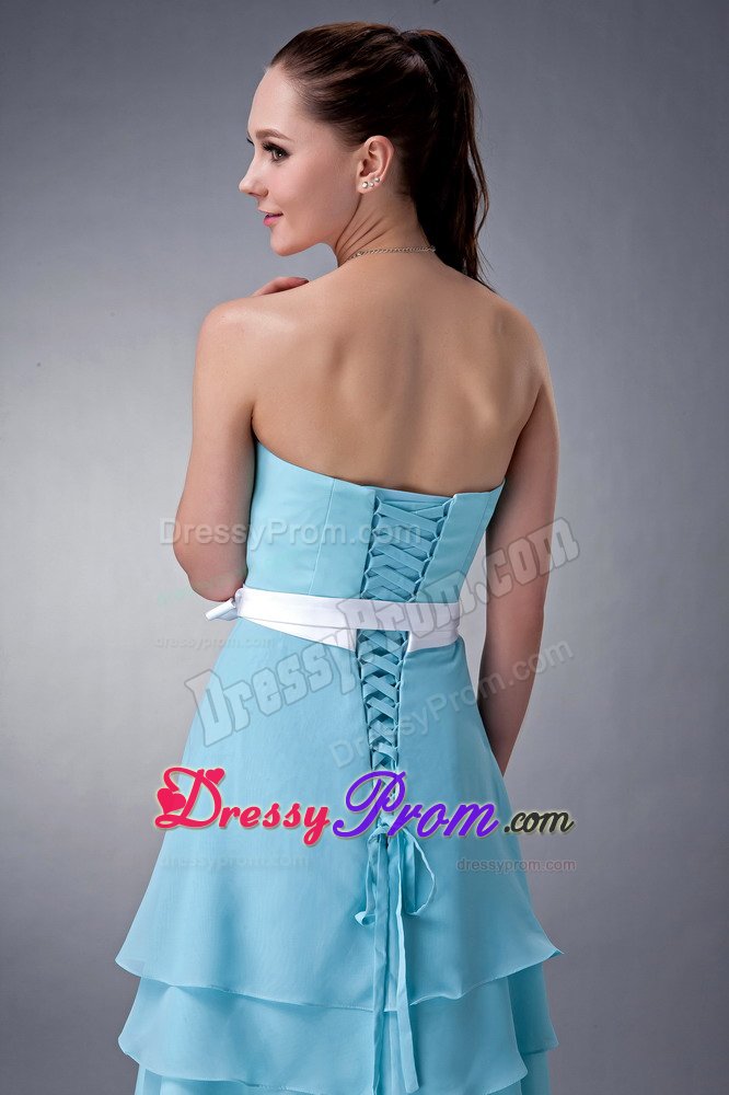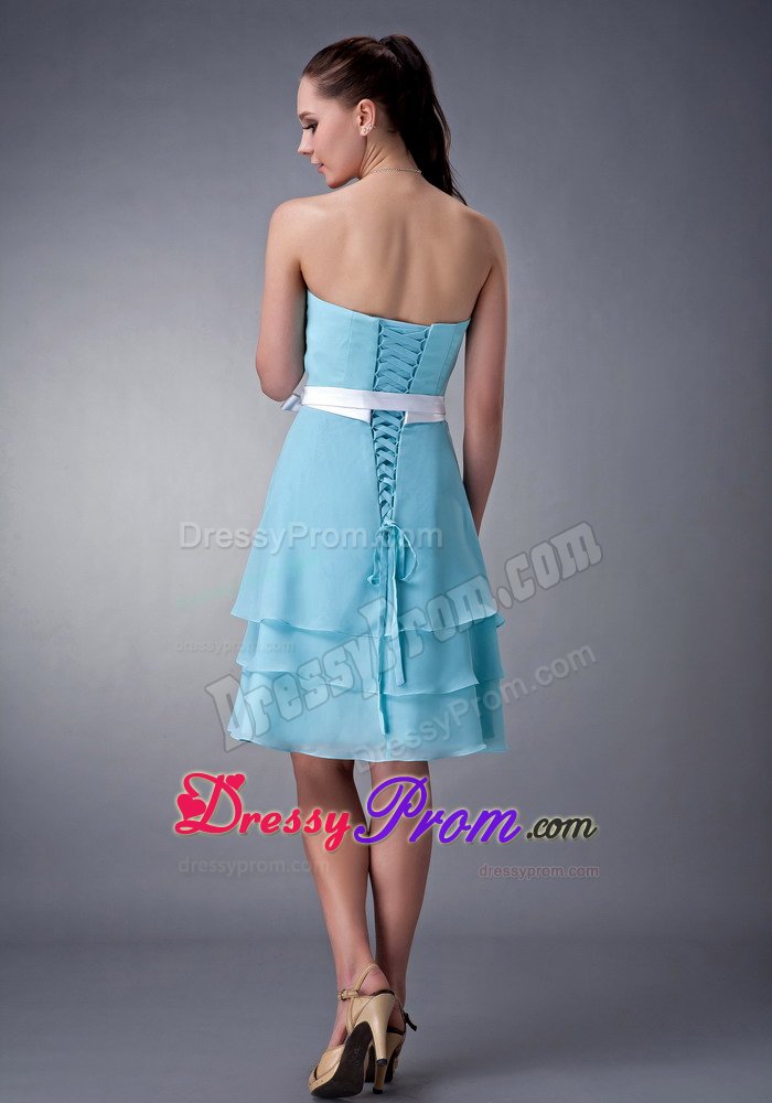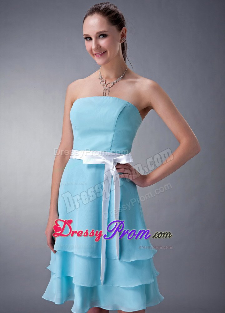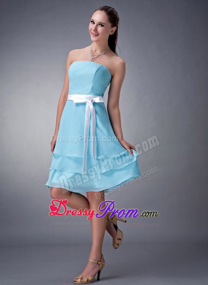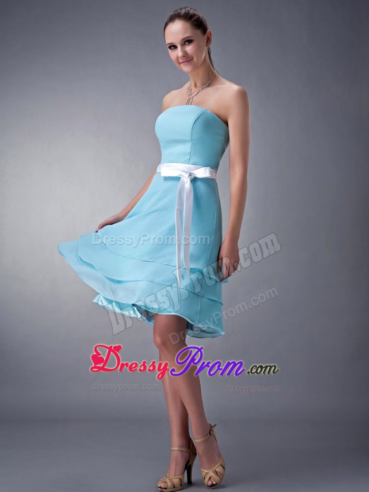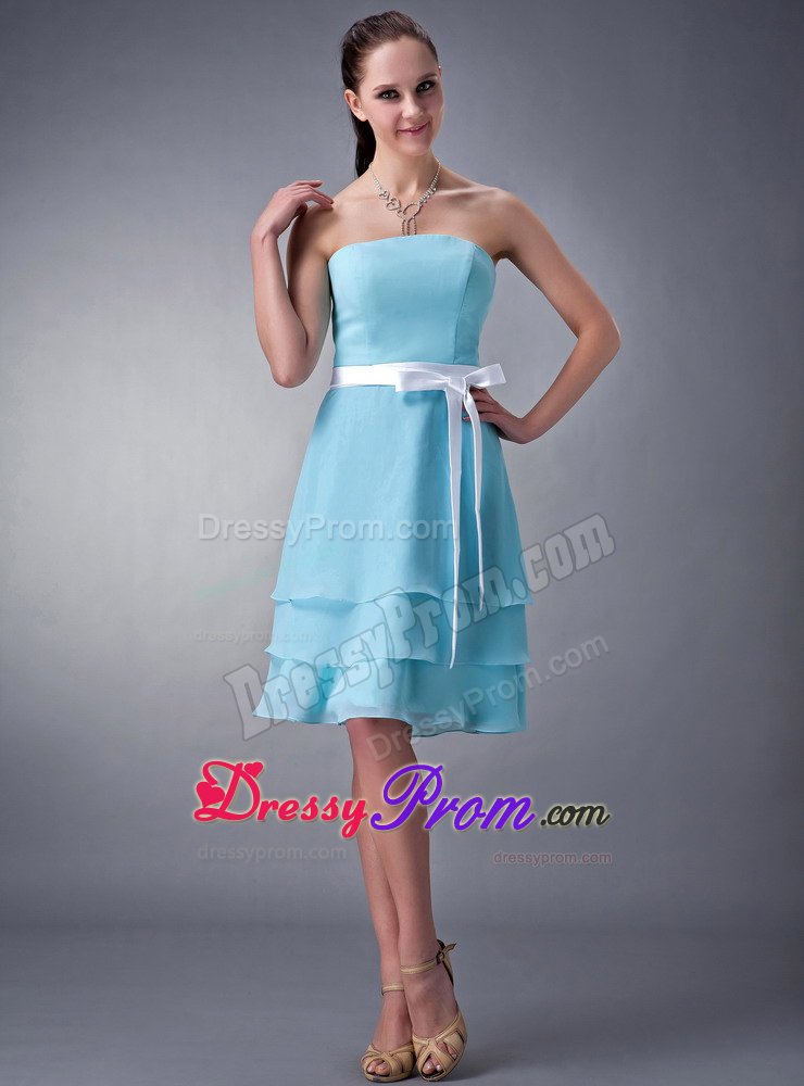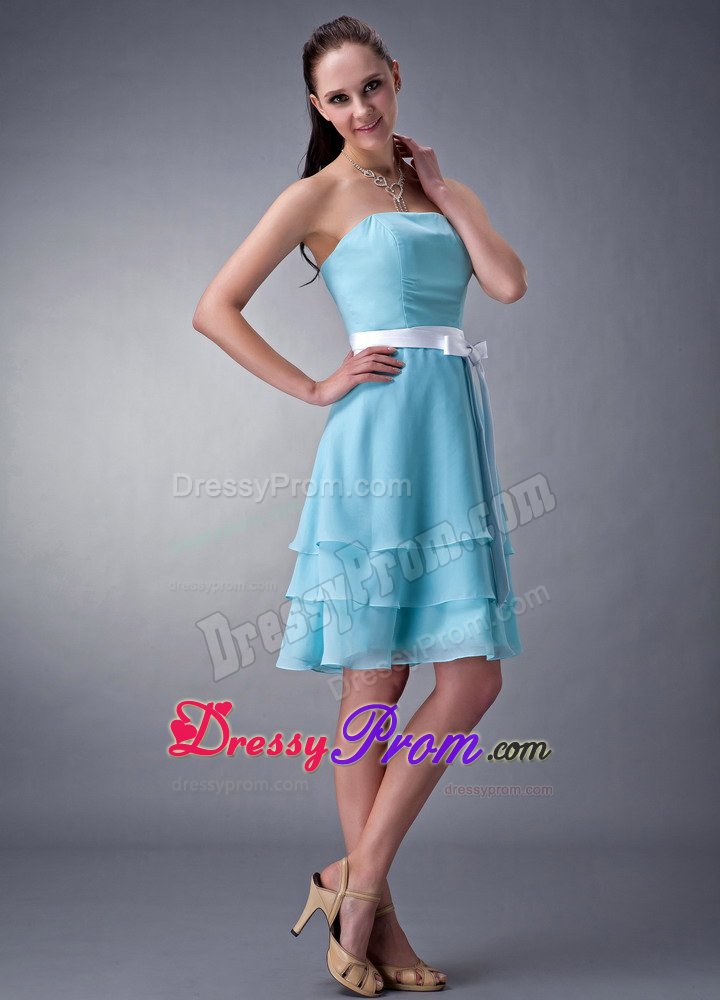 Do you want your bridesmaids to be elegant and modest? If so, that blue one is your best choice. This bridesmaid dress features a strapless neckline and a tightly hugging bodice. The waist is emphasized with a pretty waistband and a bow. Soft and multi-tiered chiffon skirt flows freely almost to the knee to create a sense of sweety.