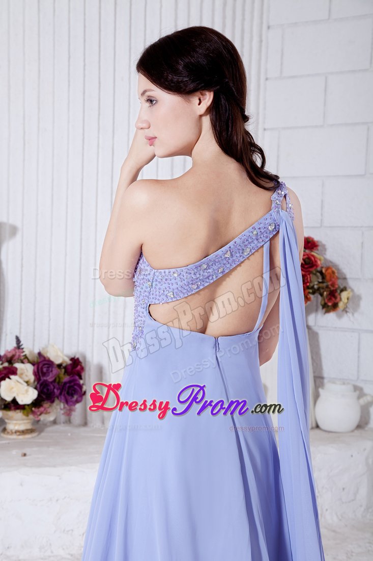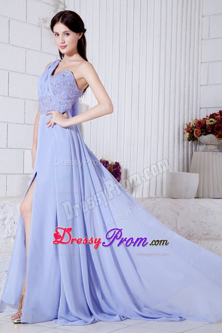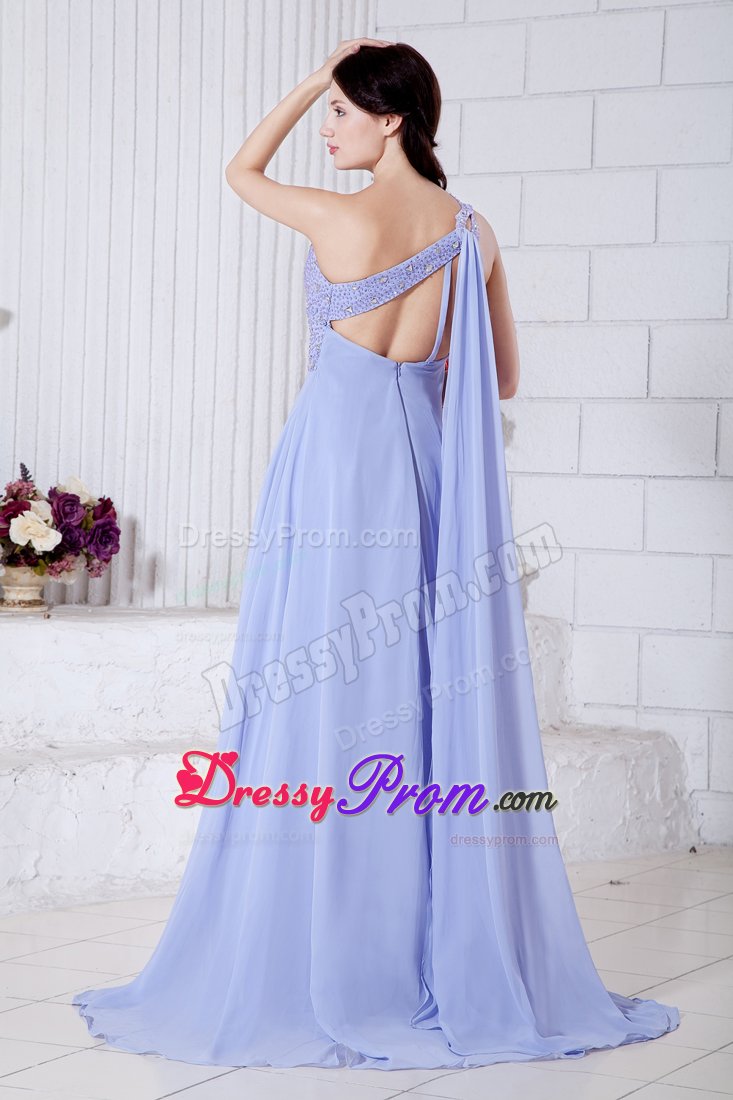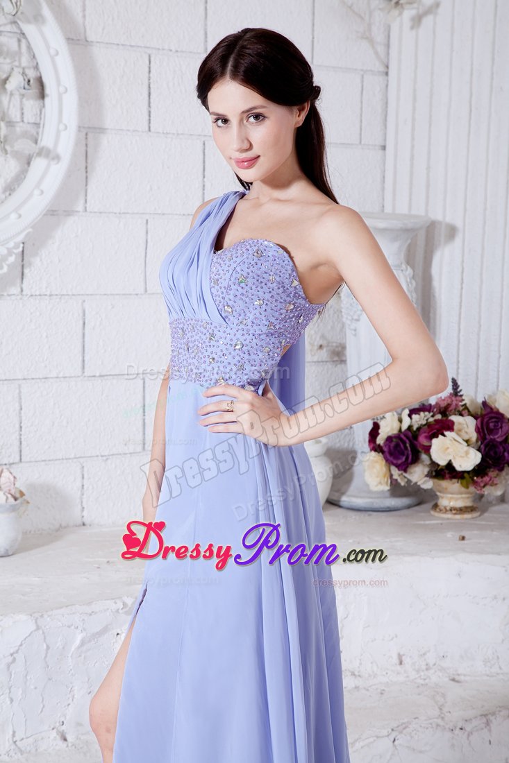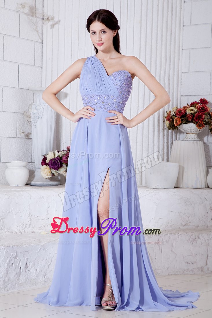 Stunning and sophisticated are two words to perfectly describe this dress. It features a gorgeous one shoulder bodice that's heavily embellished with intricate beadwork and exquisite ruchings. The single strap is also heavily embellished and crosses the open back at the shoulder. A sheath of fabric is woven into the bodice and flows across the shoulder like a shawl. The floor-length skirt with a sexy slit is smooth and elegant and extends into a lovely train in the back. This wonderful design completes with a zipper up.