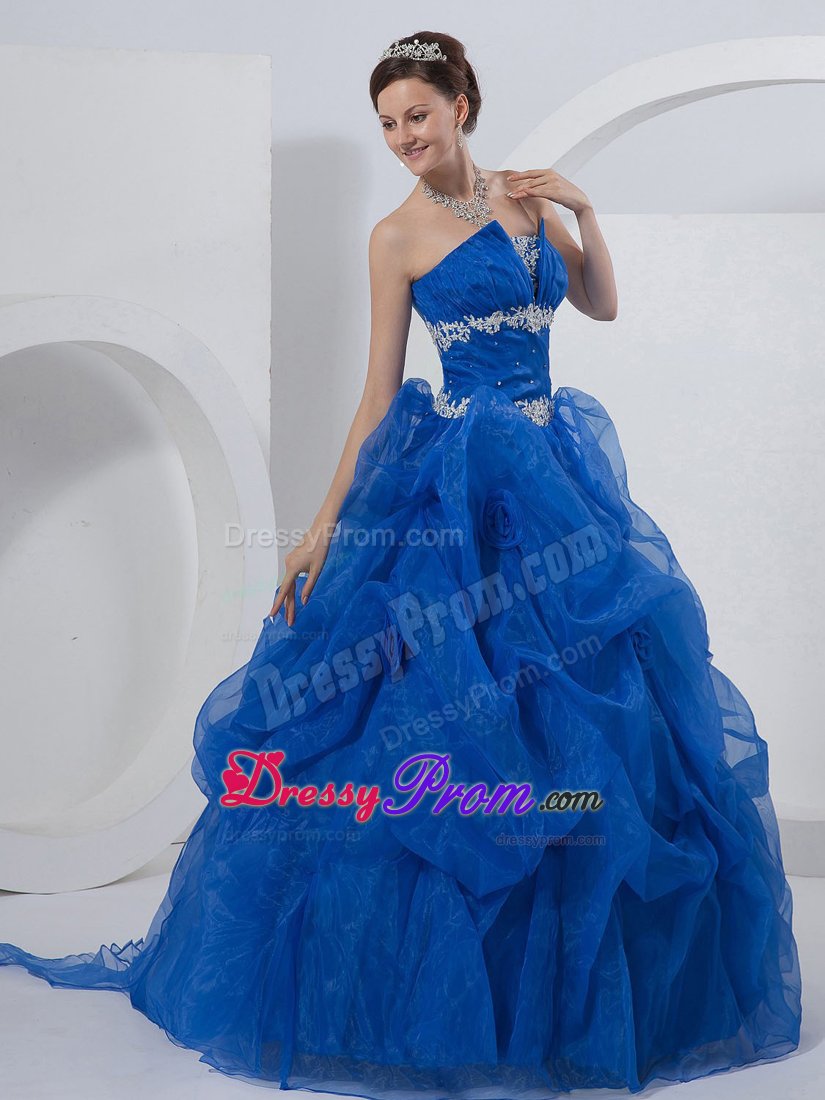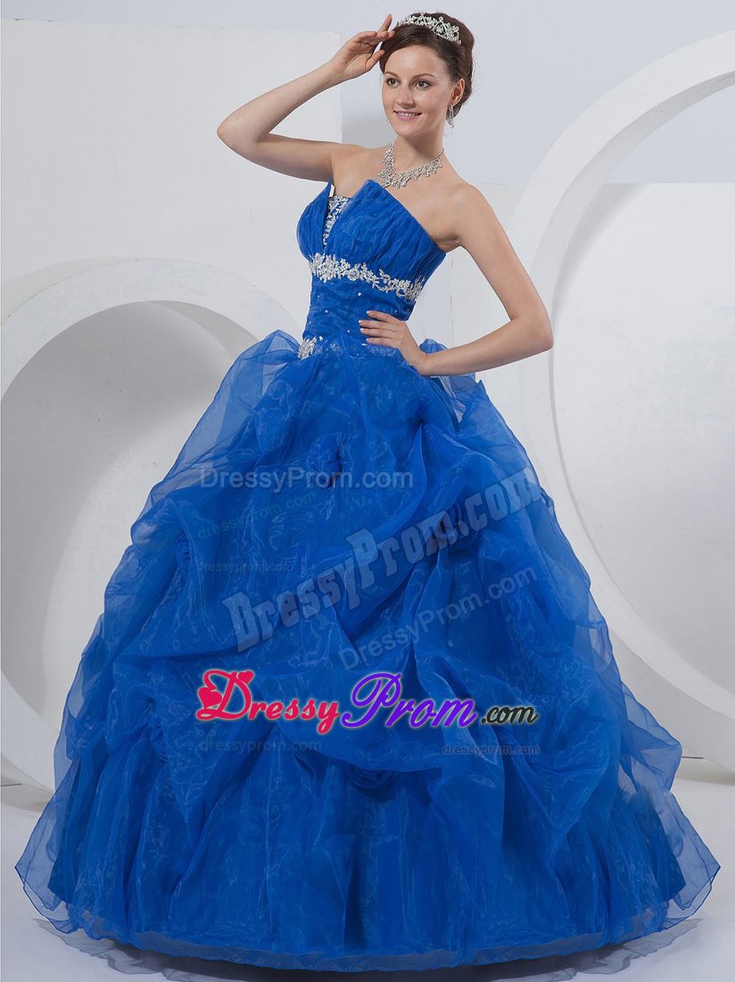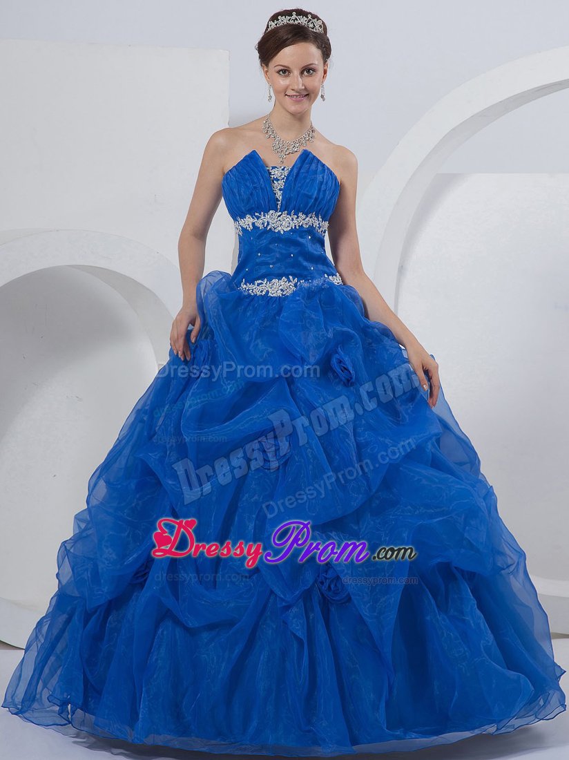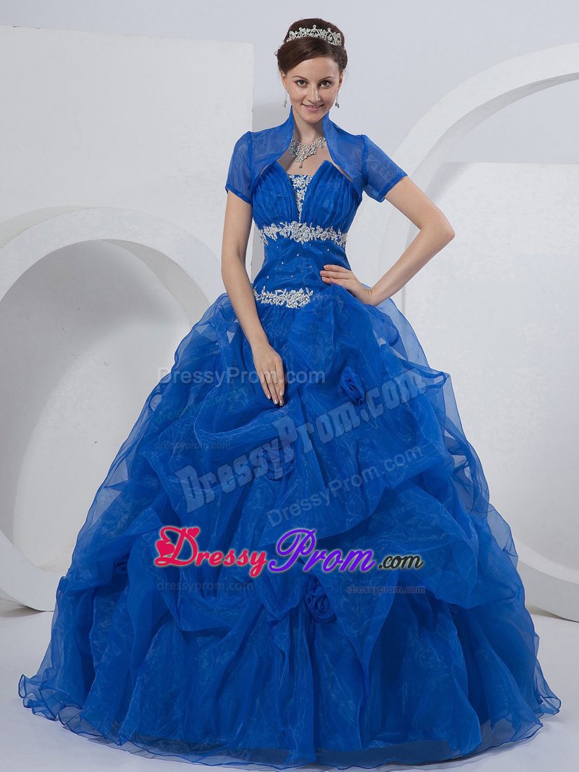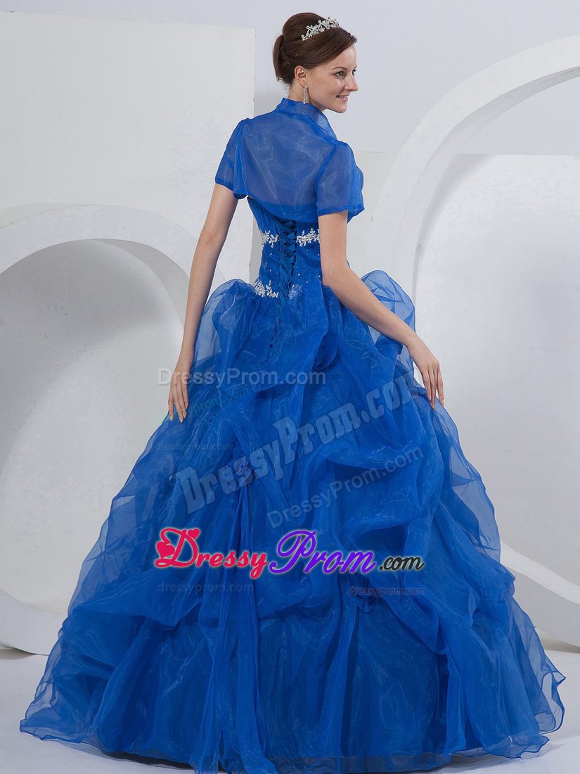 So pretty and gorgeous this royal blue quinceanera dress is! The natural, strapless bodice is accented with some shimmring beadings. The ruching throughout the bust area shows your slim figure completely. The ball gown skirt with some hand made flowers makes this design exquisite and graceful. There is also a matching jacket for you to cover your shoulders, but it's up to you whether you want to order it or not. A lace-up closure completes this fabulous dress. You will be the spotlight in the party.