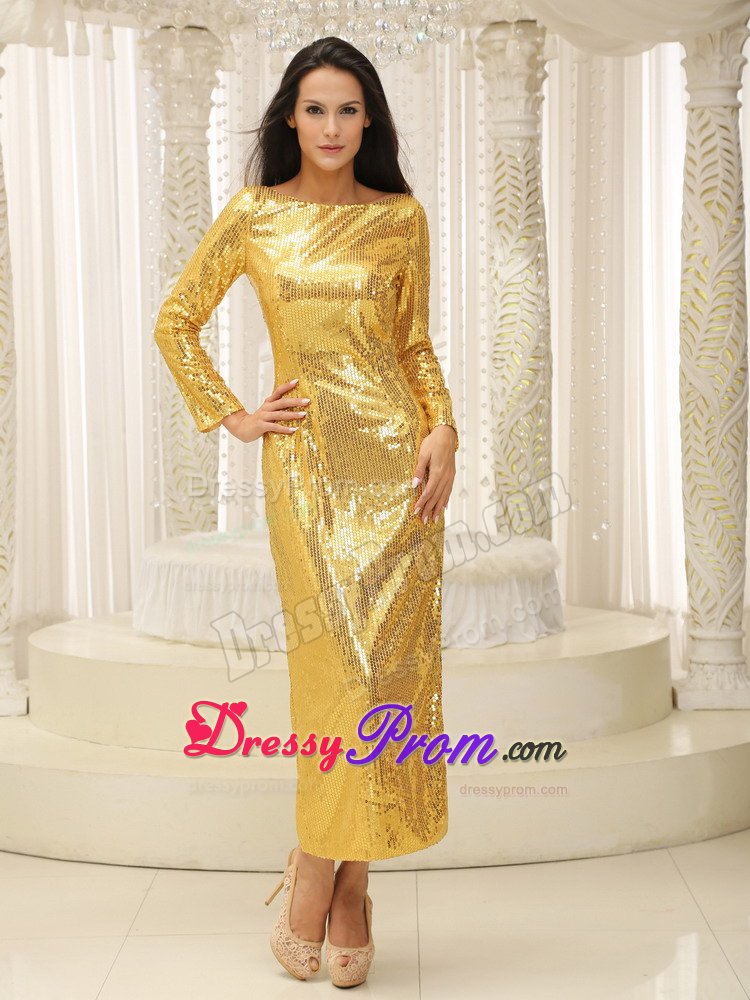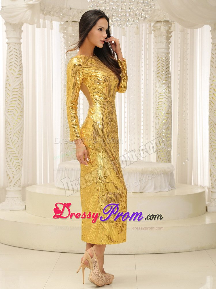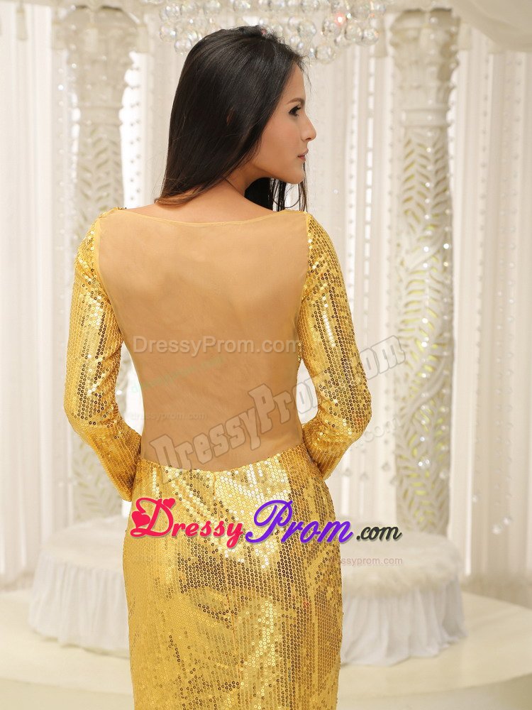 One can find no words that is suitable enough to describe the feeling when seeing this dress. The dress is so sassy and stunning that you will surely be eye-catching at your party. This shining prom dress features a straight neckline and long sleeves, and the whole dress is adorned with carefully placed and fashionable golden sequins. Ankle-length with side slit and a flesh-coloured back shows your beauty and sexy but without being too revealing. Don't hesitate to take it home!