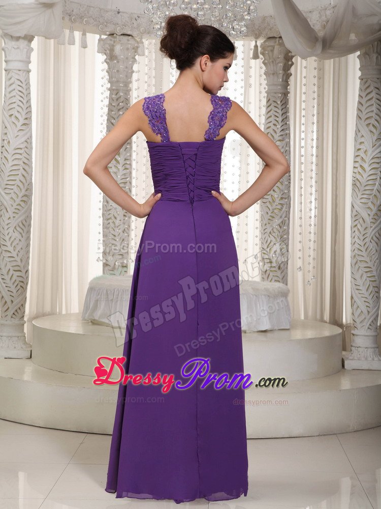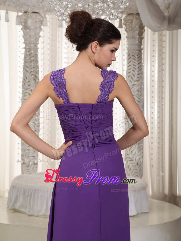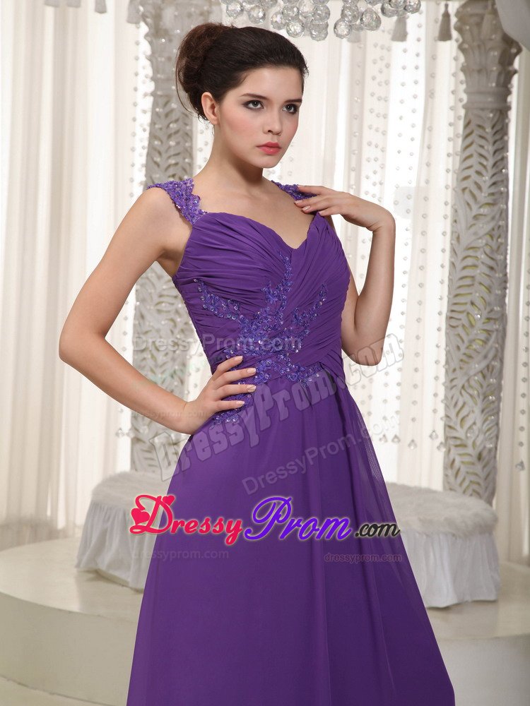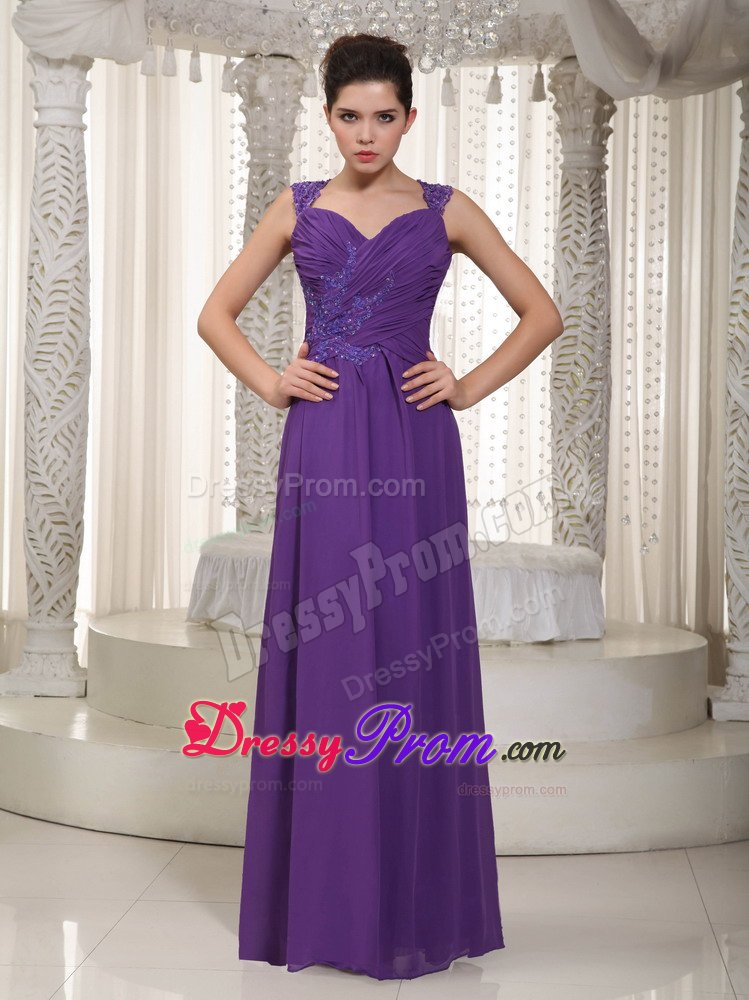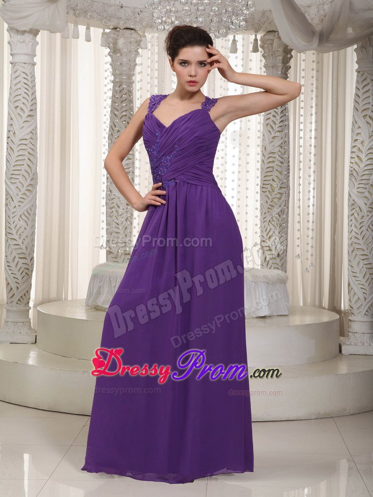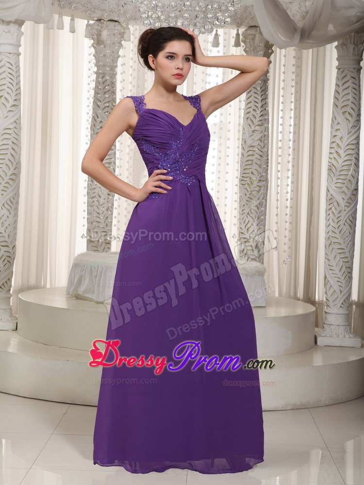Go modern in this purple chiffon prom dress . This dress has cap sleeves embellished with beading. The gown has a V-neckline and ruching through the faux wrap bust. An eye-catching beading appliques punctuates one side of the fitted bodice.The skirt is floor length with a soft billowing effect for movement. This is a high fashion design that flatters many shapes.