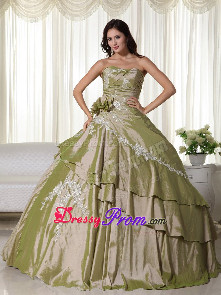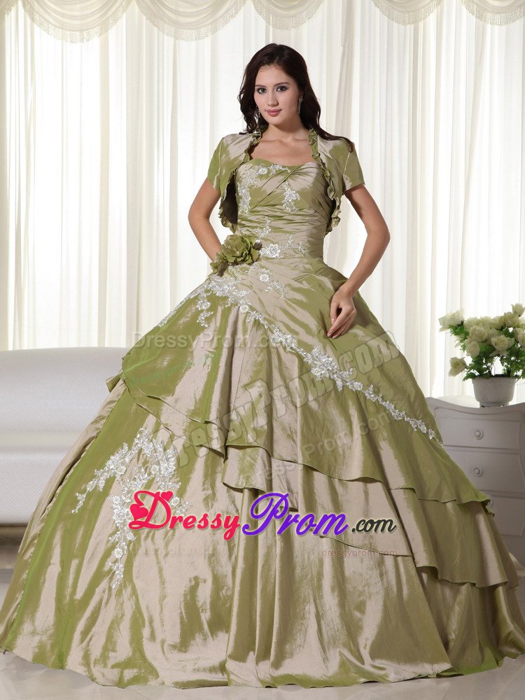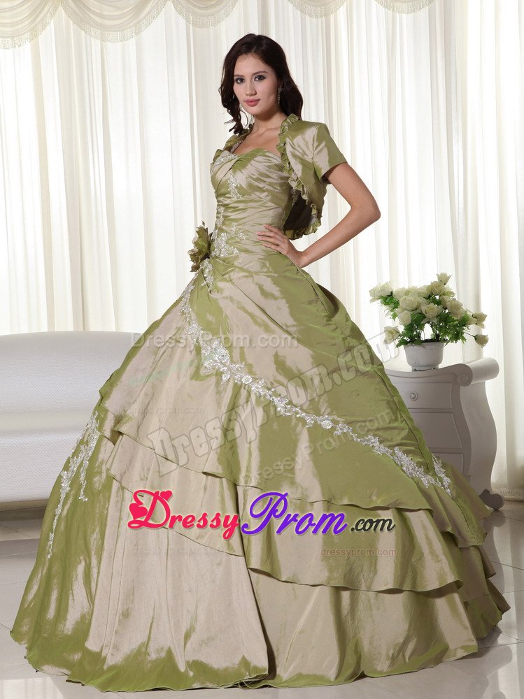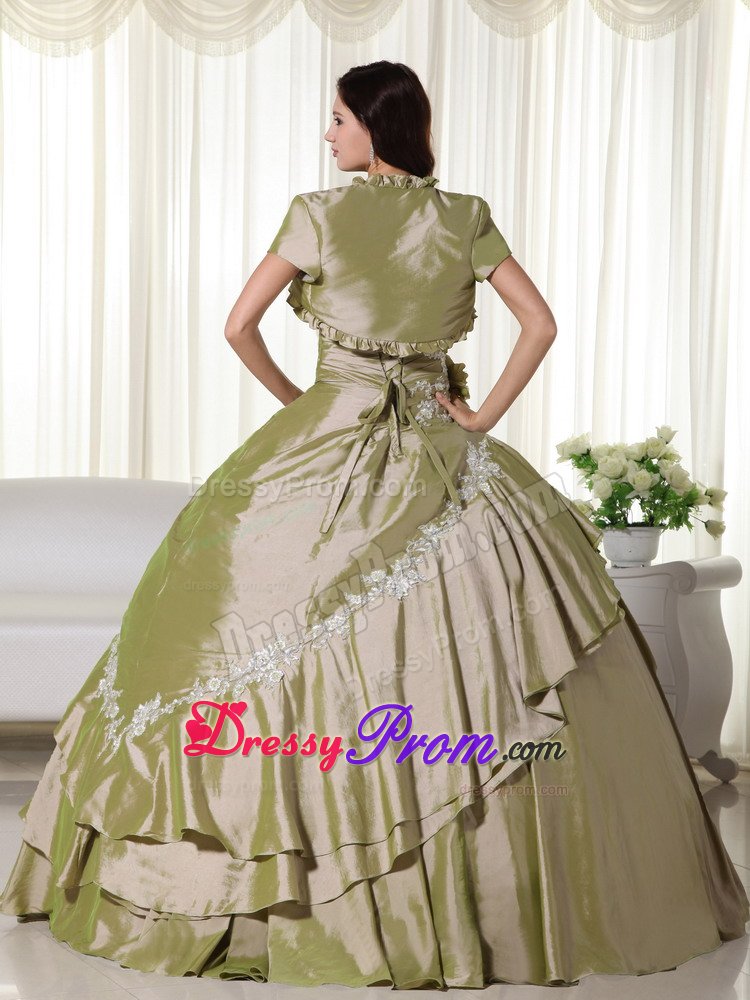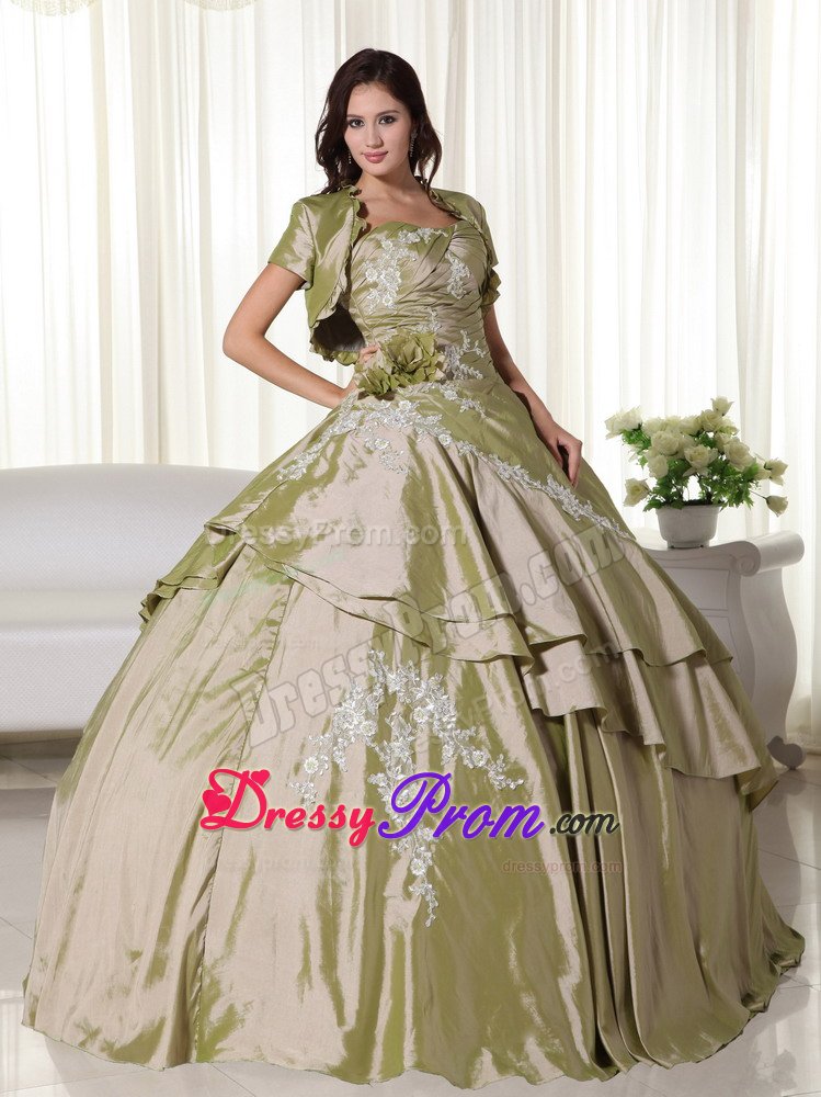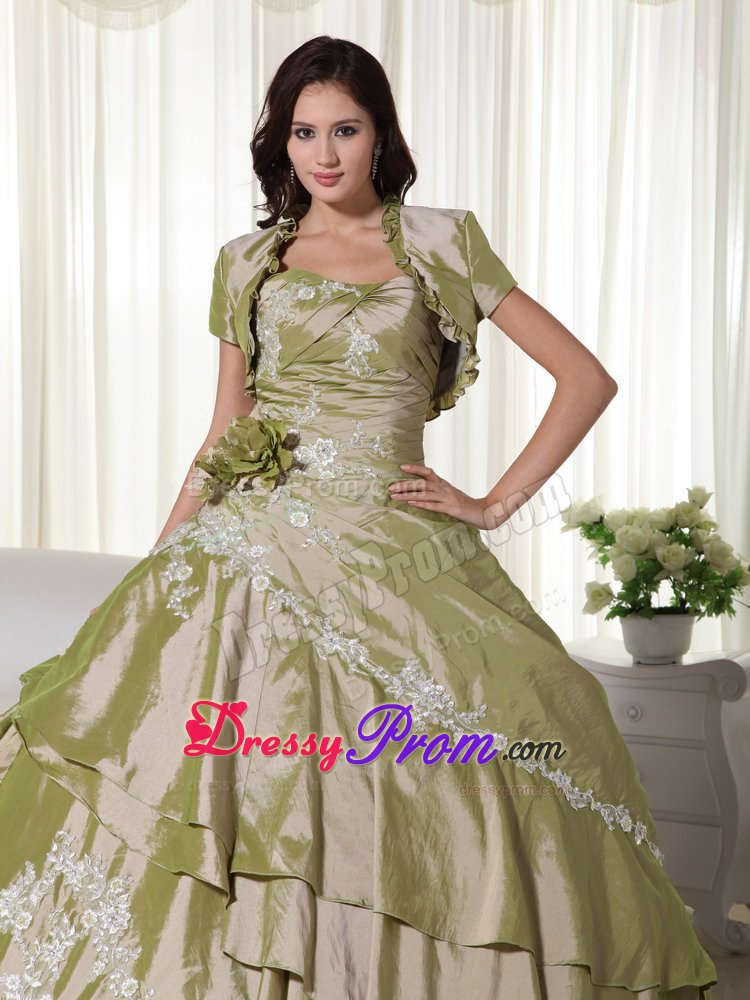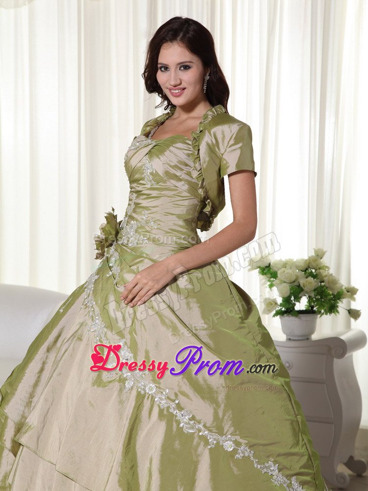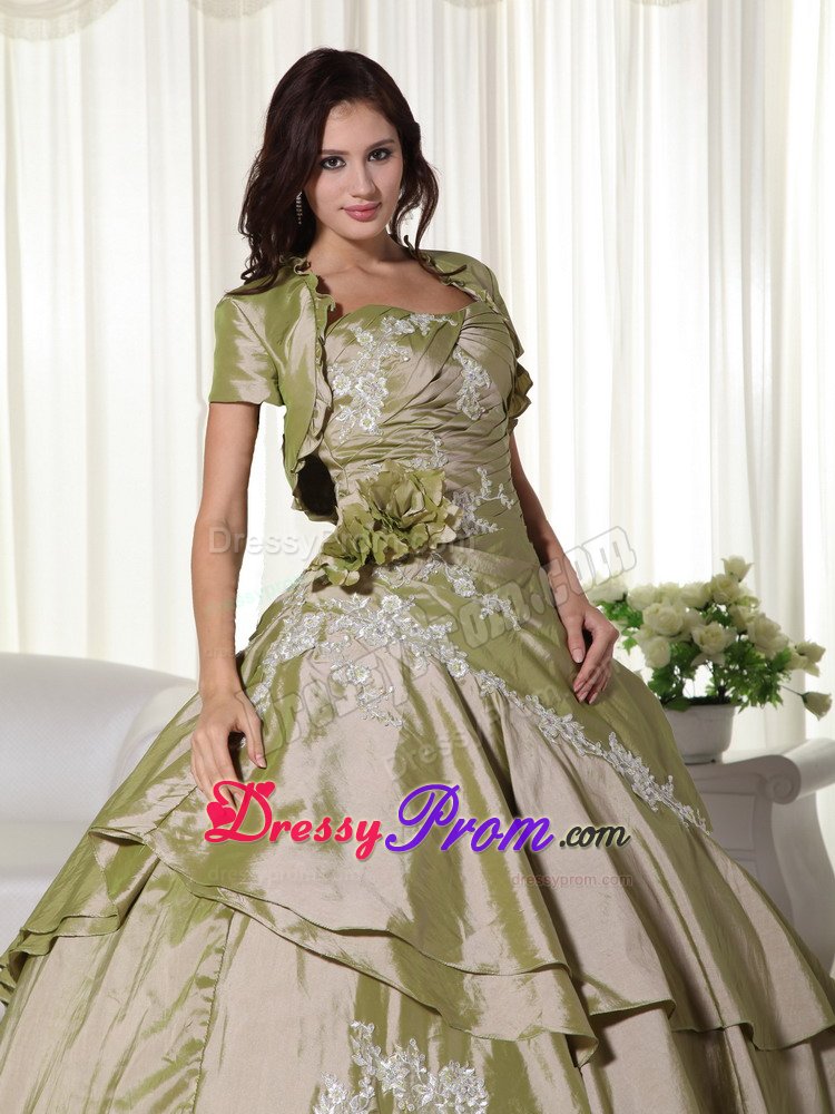 Dance the night away in this fantastic dress? The strapless bodice is pleated for a figure flattering look and features fabric and floral applique embellishments. Fitted to the hip, the asymmetrical ball gown skirt is elegantly draped and has a ribbon of rosettes that lead to a can-can style ruffled tiers. What's more, a matching jacket trimmed with cosy flower shape fabric is for a great fit.