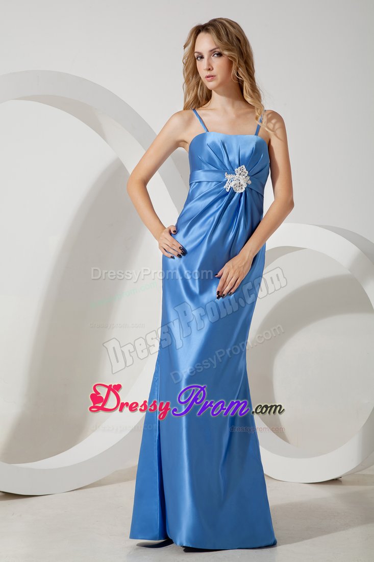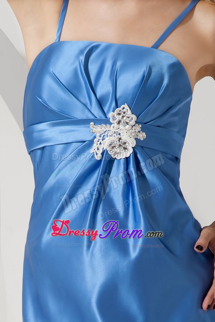You will look like a million in this elegant blue dress! This one features a spaghetti straps top covered with satin fabric and close fitting to hug curves and outline the silhouette of your body. The dress tends to show off a well-toned body. The ruches and the applique feature the waist area. The back has a hidden zipper finishes a gorgeous look. You're sure to land on everyone's best dress list!