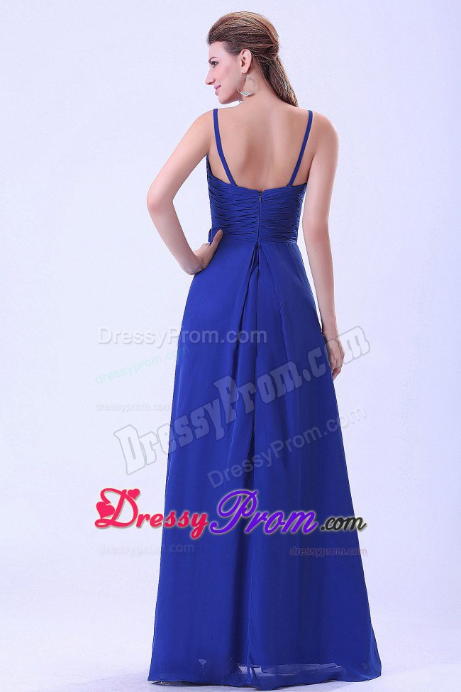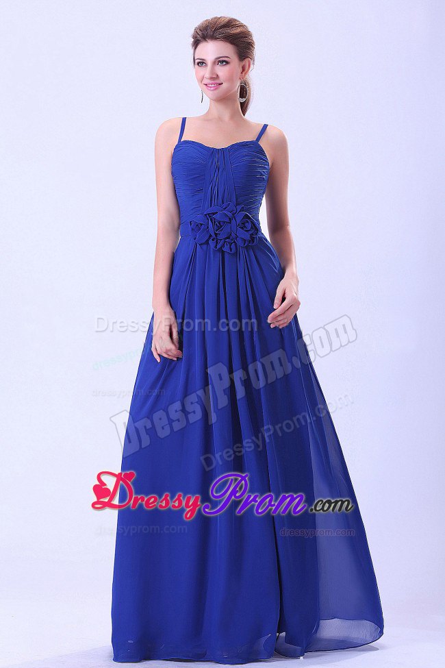 A flattering cut combined with the luxury of chiffon gives this spaghetti straps floor-length royal blue dress a ravishing style that will be the envy of everyone at prom or evening. This dress features a sweetheart neckline. The waist is adorned with ruching and hand made flowers and A hidden zipper makes for easy off and on and secures the dress in place. You will be the belle of the ball in this glittering prom gown.