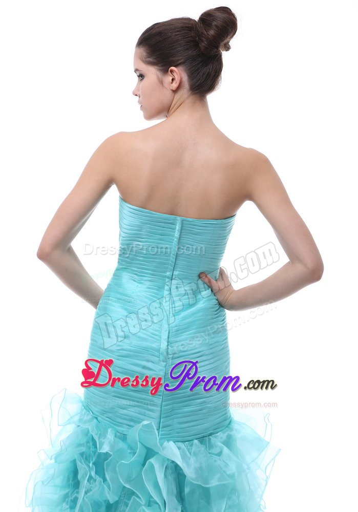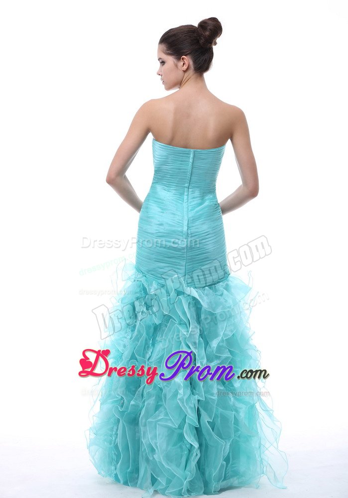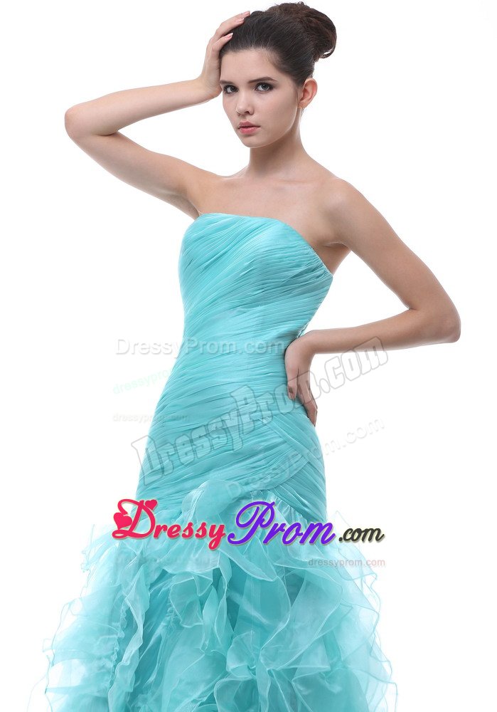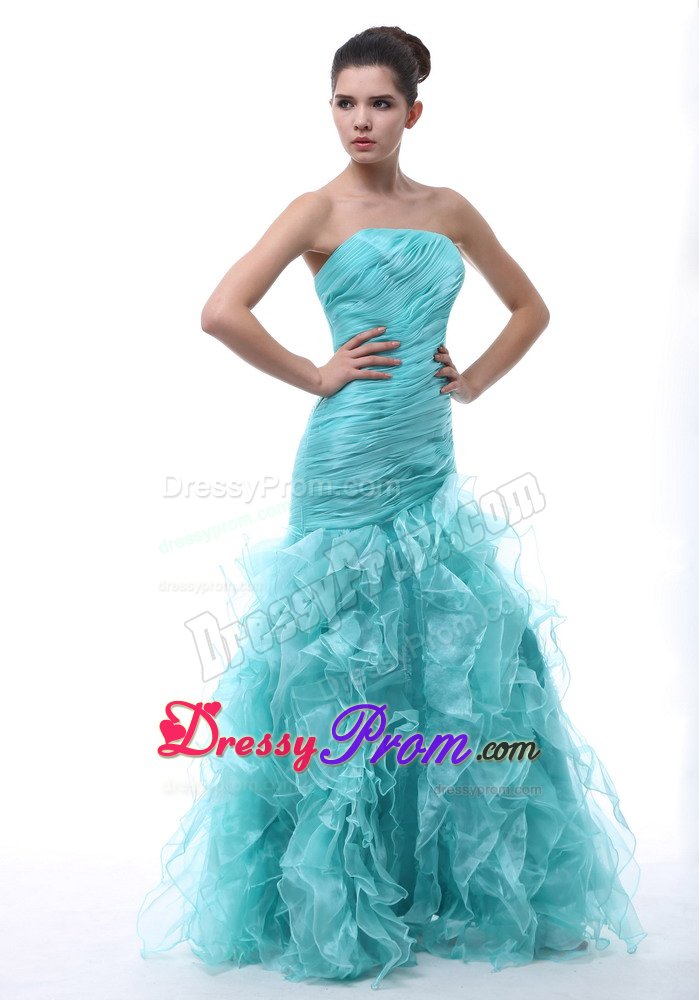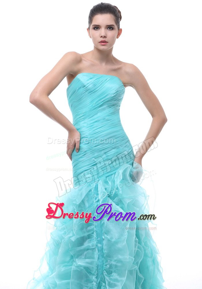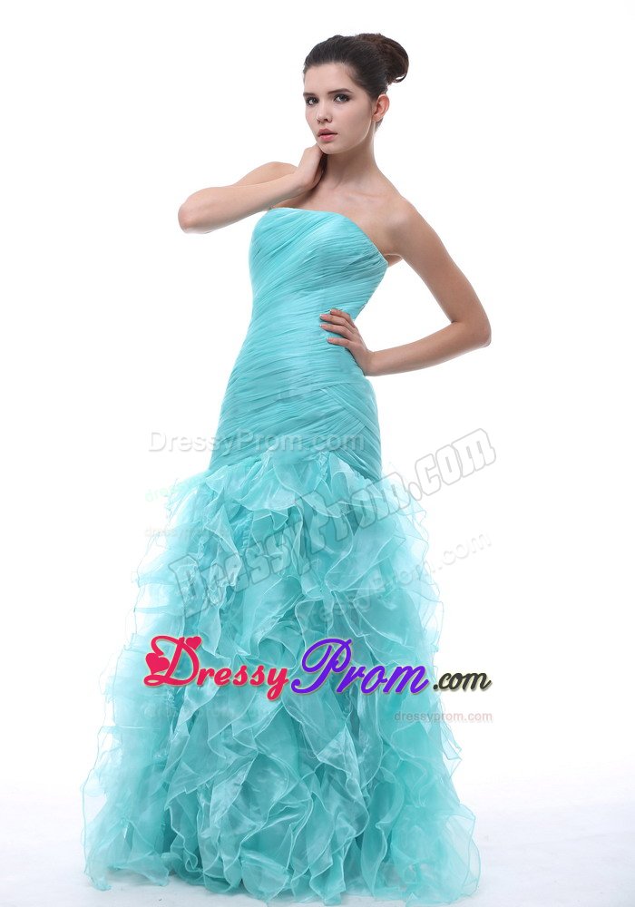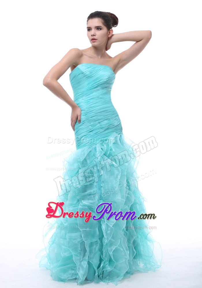 Shine like the stars in this dazzling, sexy strapless prom dress. An elegant long dress for prom or formals features a slim fitting bodice with light straight neckline and pleating accents sparkling throughout. It is completed with a flowing skirt with ruffles and zipper up back. A plethora of ruffles creates a unique look on the floor length skirt. Wearing this dress, you are surely will be a red-carpet winner.