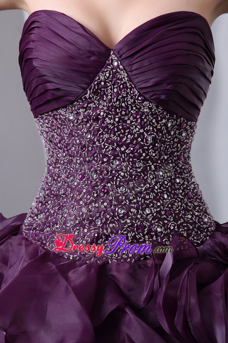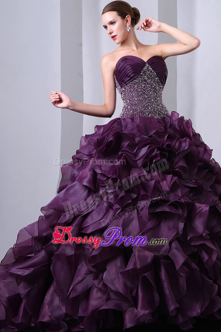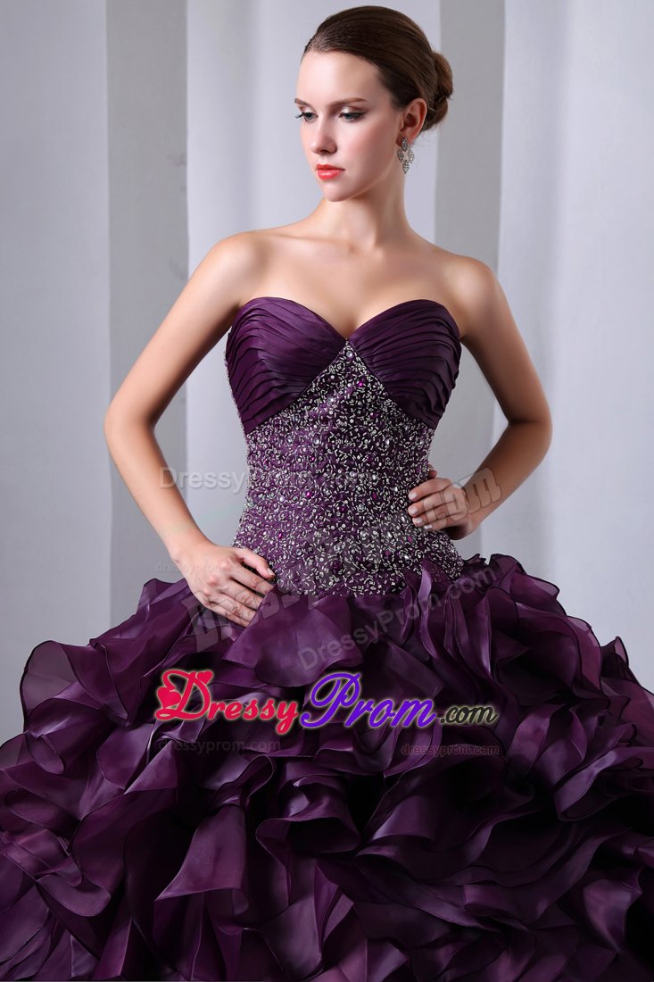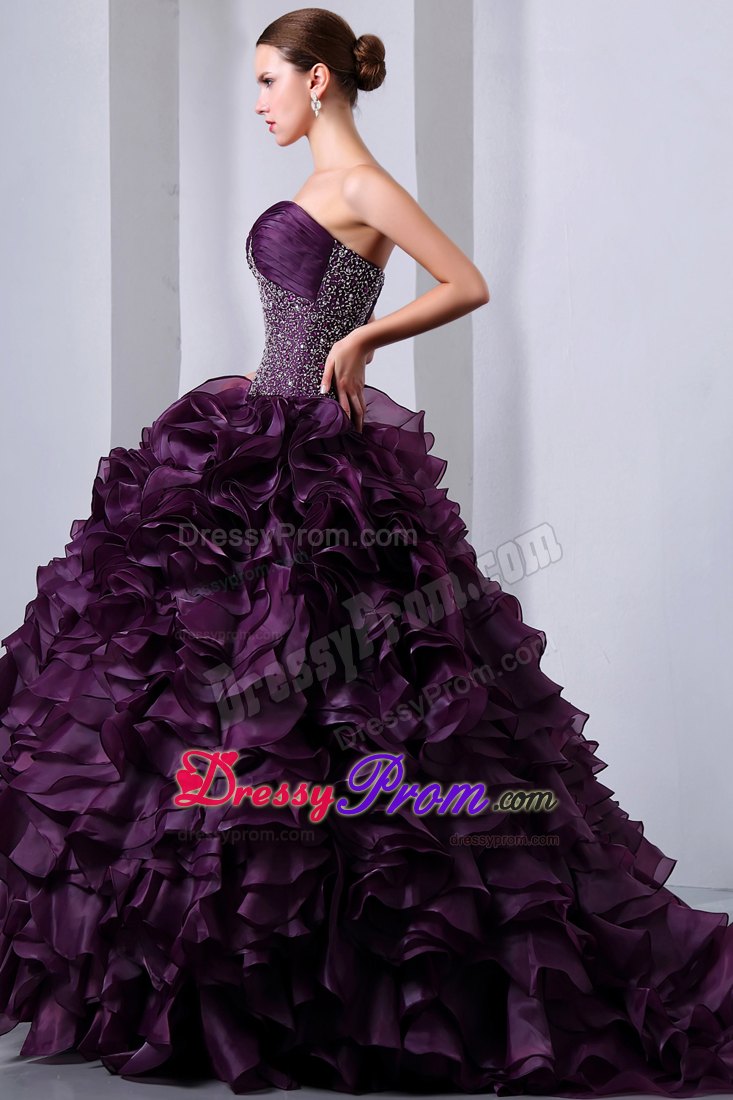 Opulence is the word written all over this dress. It truly is an example of high end couture fashion. It features a strapless bodice with sweetheart neckline. The ruched bust combines with the beading bodice perfectly. The ruffled dress sways beautifully across the floor when you move as if you're floating on air, it is complete to a brush train. A lace up corset style closure in the back secures the dress in place.