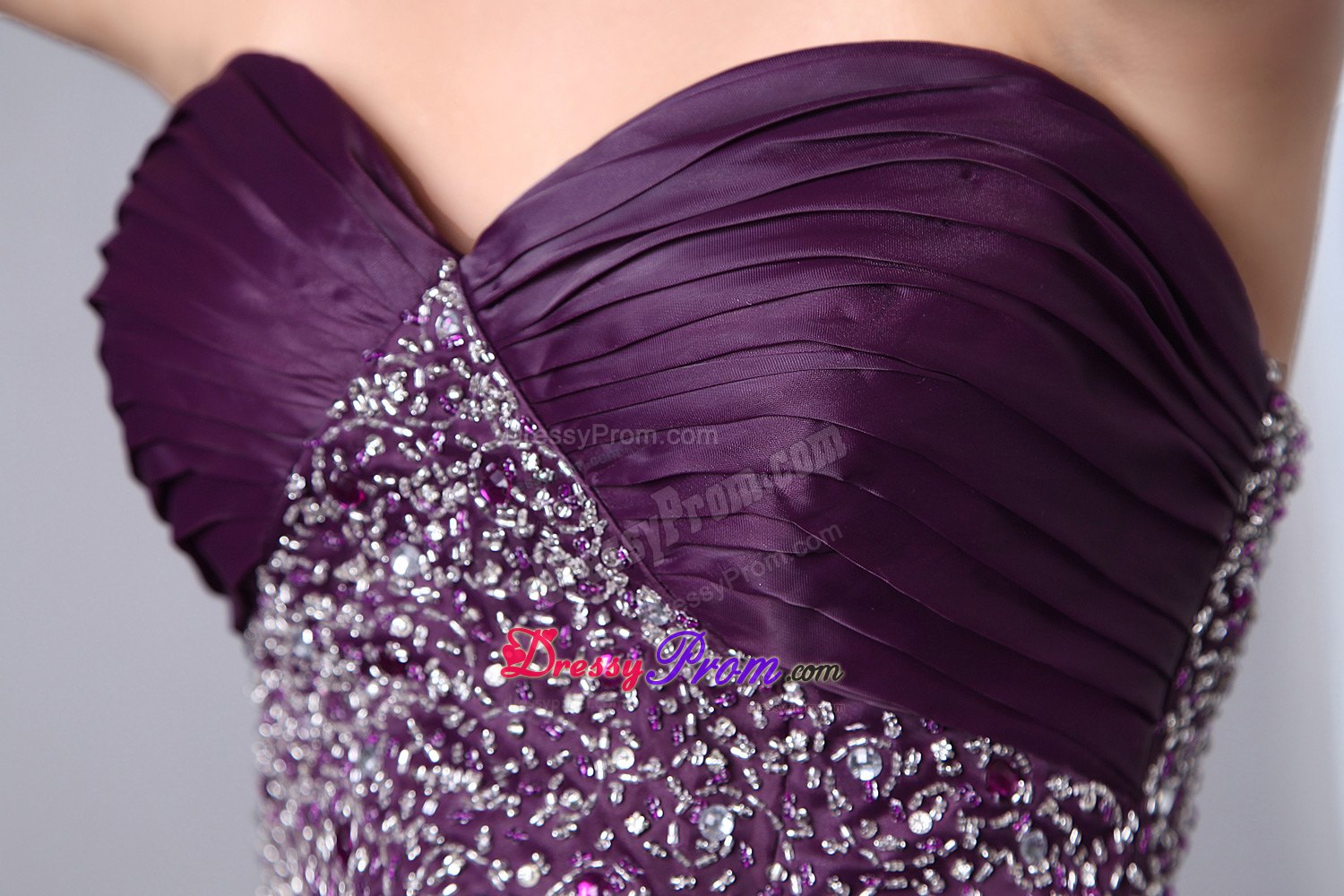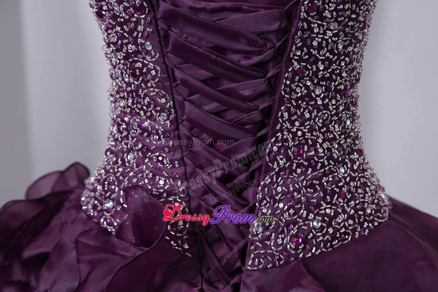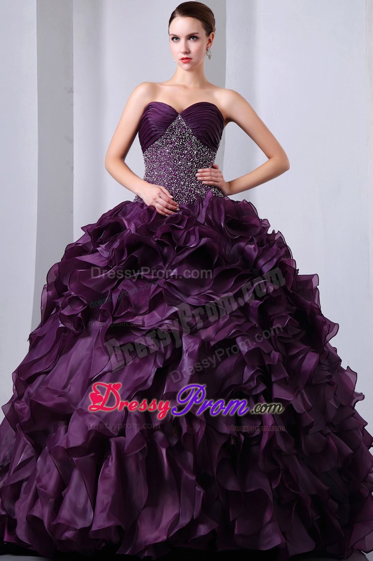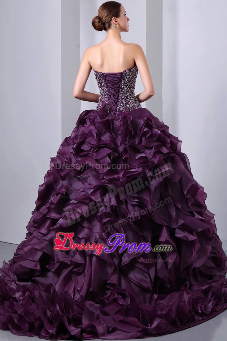 Opulence is the word written all over this dress. It truly is an example of high end couture fashion. It features a strapless bodice with sweetheart neckline. The ruched bust combines with the beading bodice perfectly. The ruffled dress sways beautifully across the floor when you move as if you're floating on air, it is complete to a brush train. A lace up corset style closure in the back secures the dress in place.