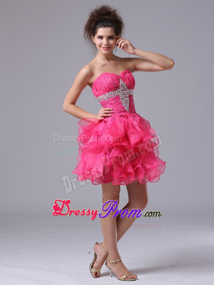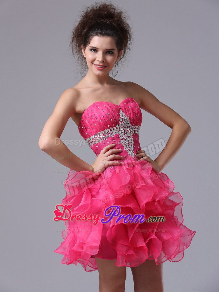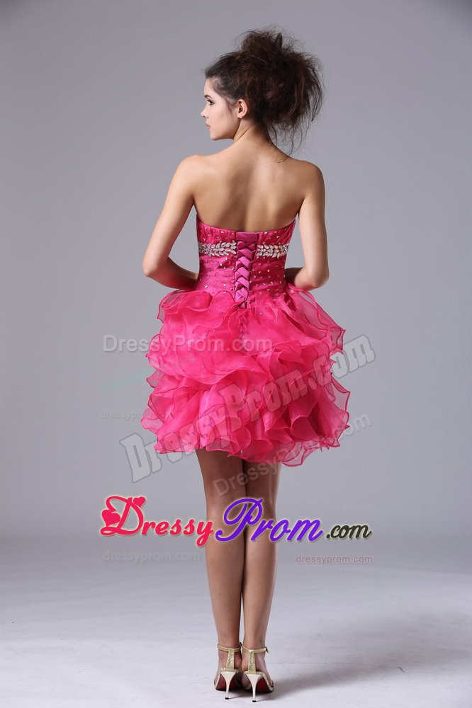 Do you want to experience the feeling of being the spotlight? This pink prom dress will make your dream come ture. It features a strapless bodice with a sweetheart neckline. The ruched bodice is highlighted with the scattered beadings. The exqisite beadwork in the bust area contours your curve perfectly. The other point is the organza ruffled mini-skirt. The lace up in the back of the dress secures it in place and makes for easy off and on.A stunning dress you can't miss.