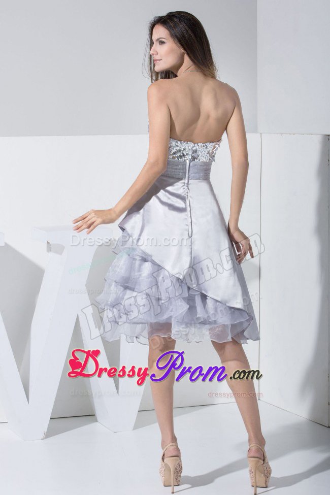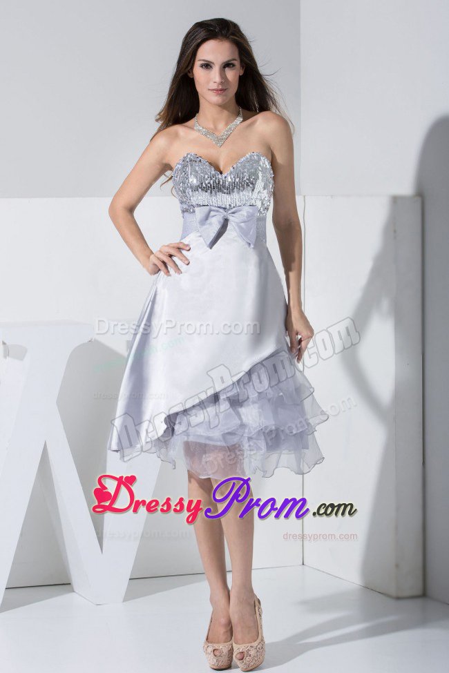 Gorgeous is the word written all over this dress. A fitted, strapless bodice made of an all-over sequin accenting the sweetheart neckline. Featured with short styles and high quality taffeta and organza materials, this dress is the right choice for one who want to enjoy a fantastic party. Grey color and bowknot add the charm. Easy fitting from the lace up back.