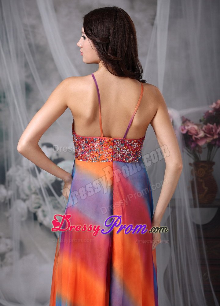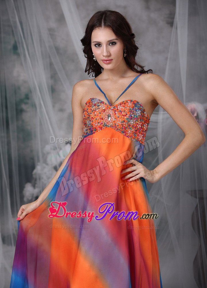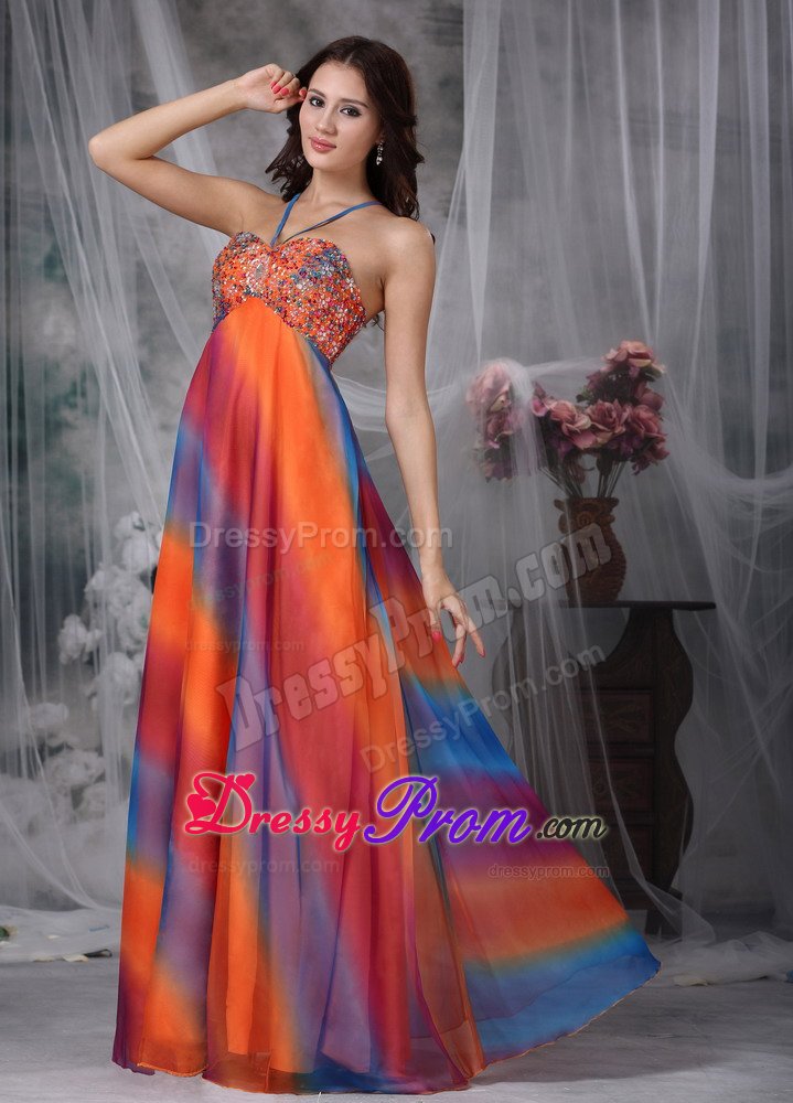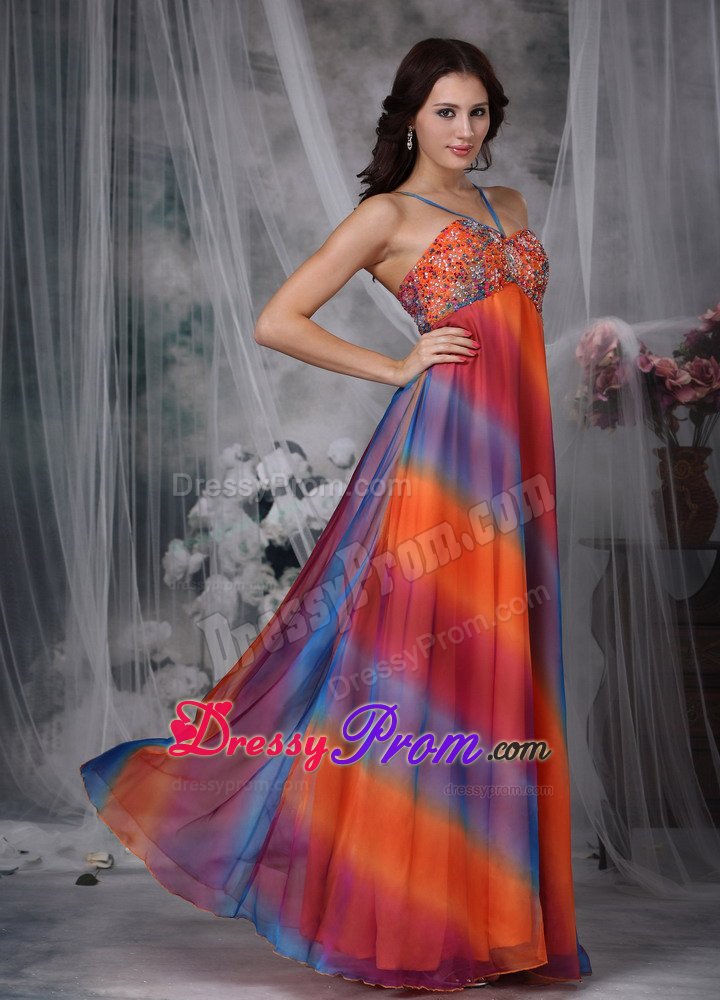 If you ever wanted to wear a rainbow, this dress could be as close as you'll come! This multicolor prom dress features a low cut halter top neckline and sequin covered bodice. The A-line skirt features a flowy chiffon overlay with colorful straps just like the rainbow. The low cut back is sexy and charming enough for you to dance the night away.