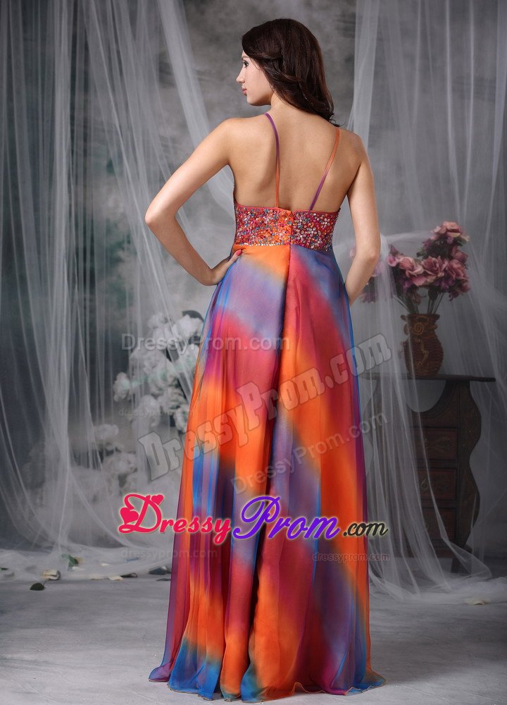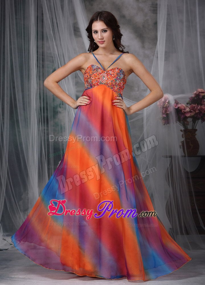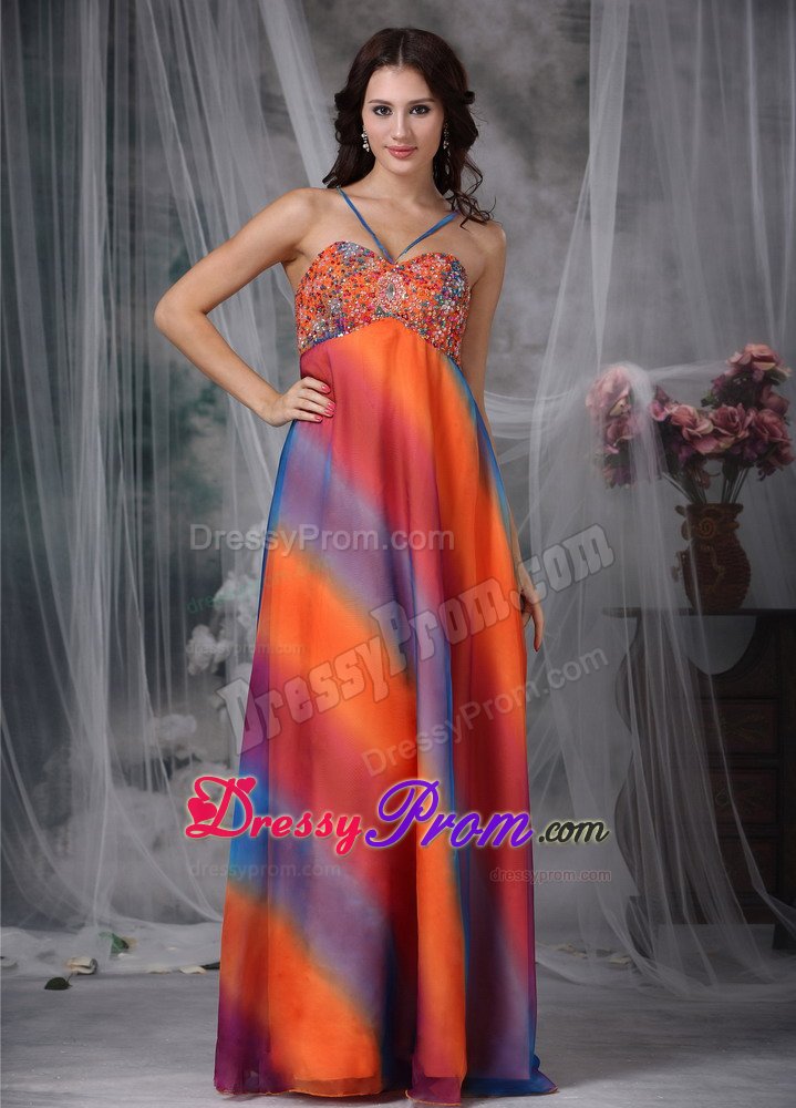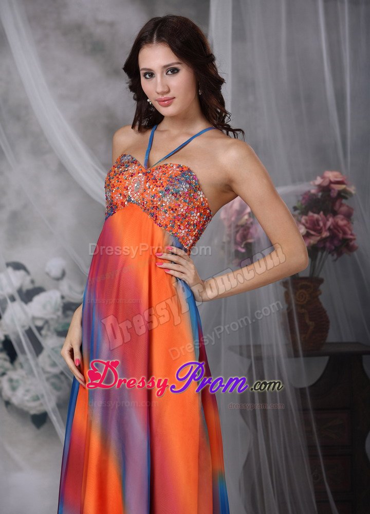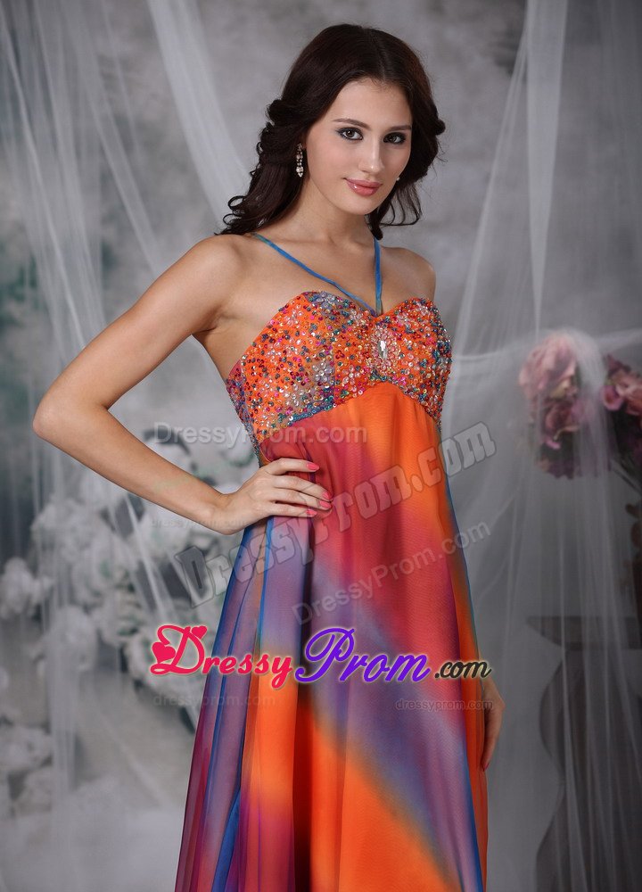 If you ever wanted to wear a rainbow, this dress could be as close as you'll come! This multicolor prom dress features a low cut halter top neckline and sequin covered bodice. The A-line skirt features a flowy chiffon overlay with colorful straps just like the rainbow. The low cut back is sexy and charming enough for you to dance the night away.