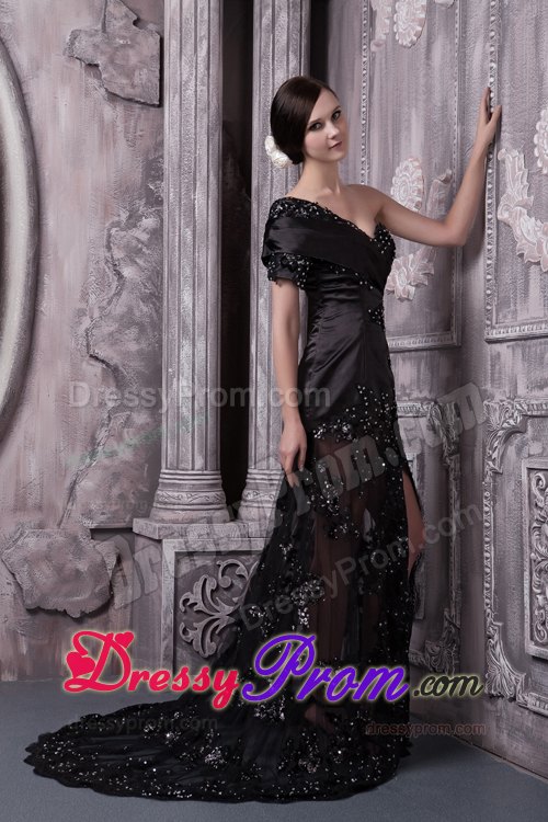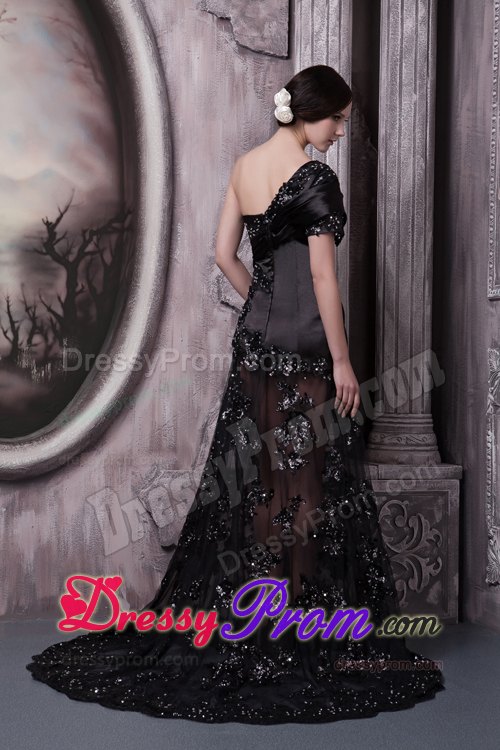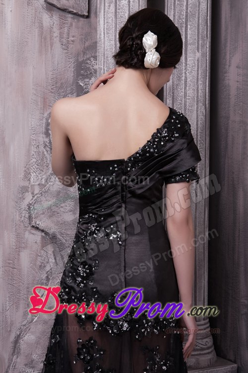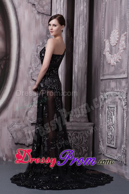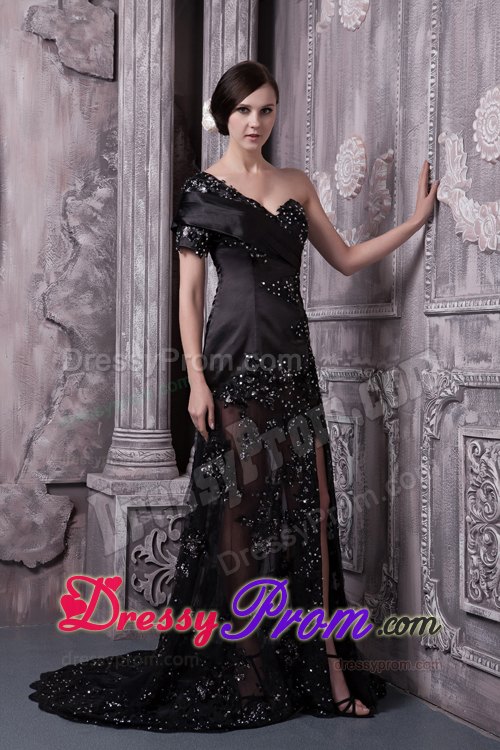 Black alluring color and sparkling beaded accents create a sensational long prom dress. This slinky style shows off curves perfectly to make a sultry statement. The one-shoulder bodice is embellished with large glimmering rhinestones, which are real attention grabbers. A long see-through skirt with nice beadings and a dramatic side slit to accentuate your curves. The hidden zipper in the back of the dress secures it in place and makes for easy off and on. So versatile and so pretty � use it as a base to create a look all your own!