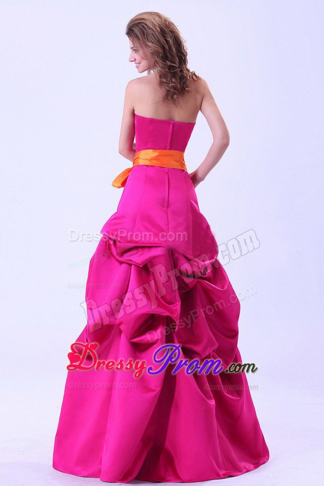 This is a lovely dress and would make beautiful addition to anyone's formal wardrobe! This strapless hot pink dress is highlighted by the contrasting orange colored sash and bow, creating a wonderful view for the fabulous dress. Feminine pick ups skirt is the perfect touch. Zipper up design makes it easy to put on and off. Come and make your day special and rememberable with this special gown!