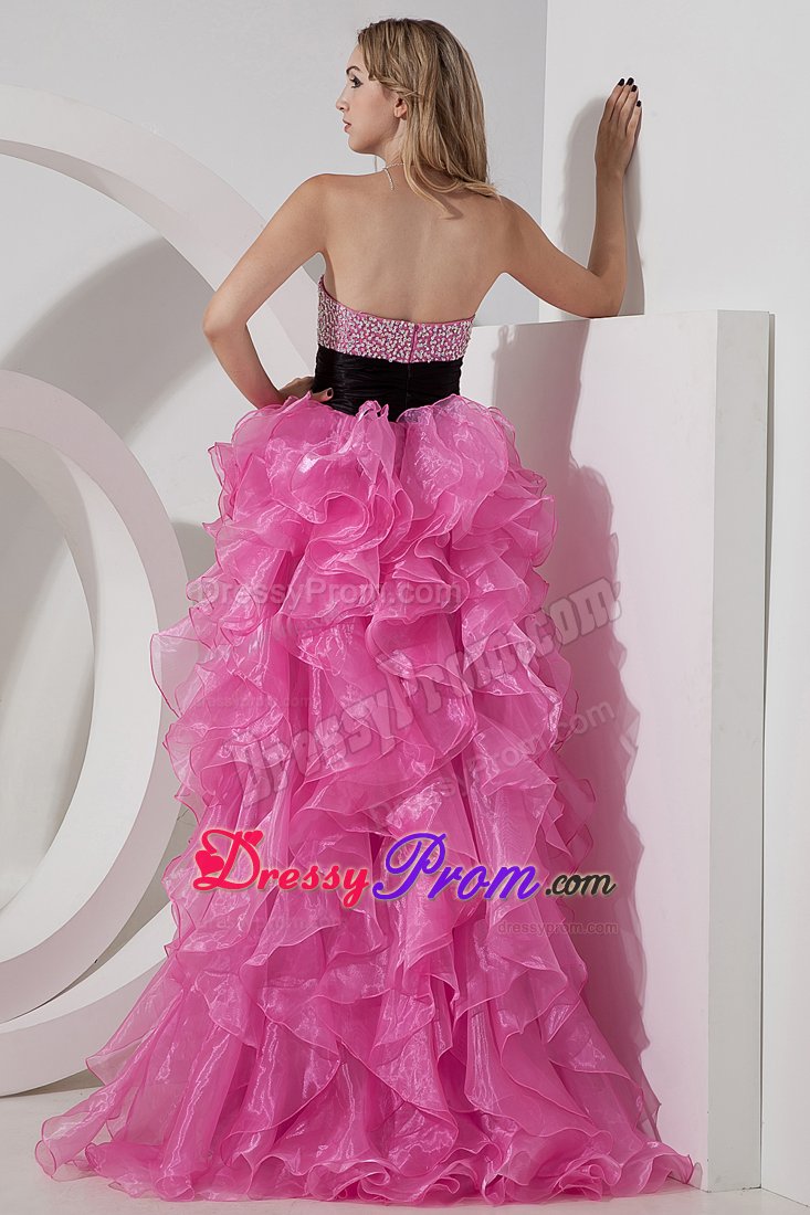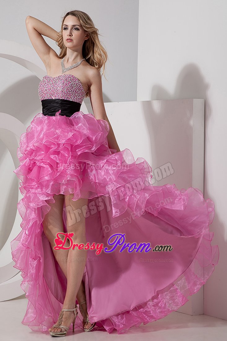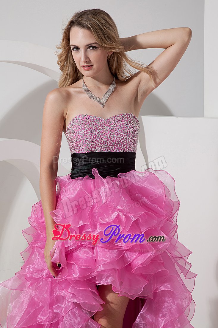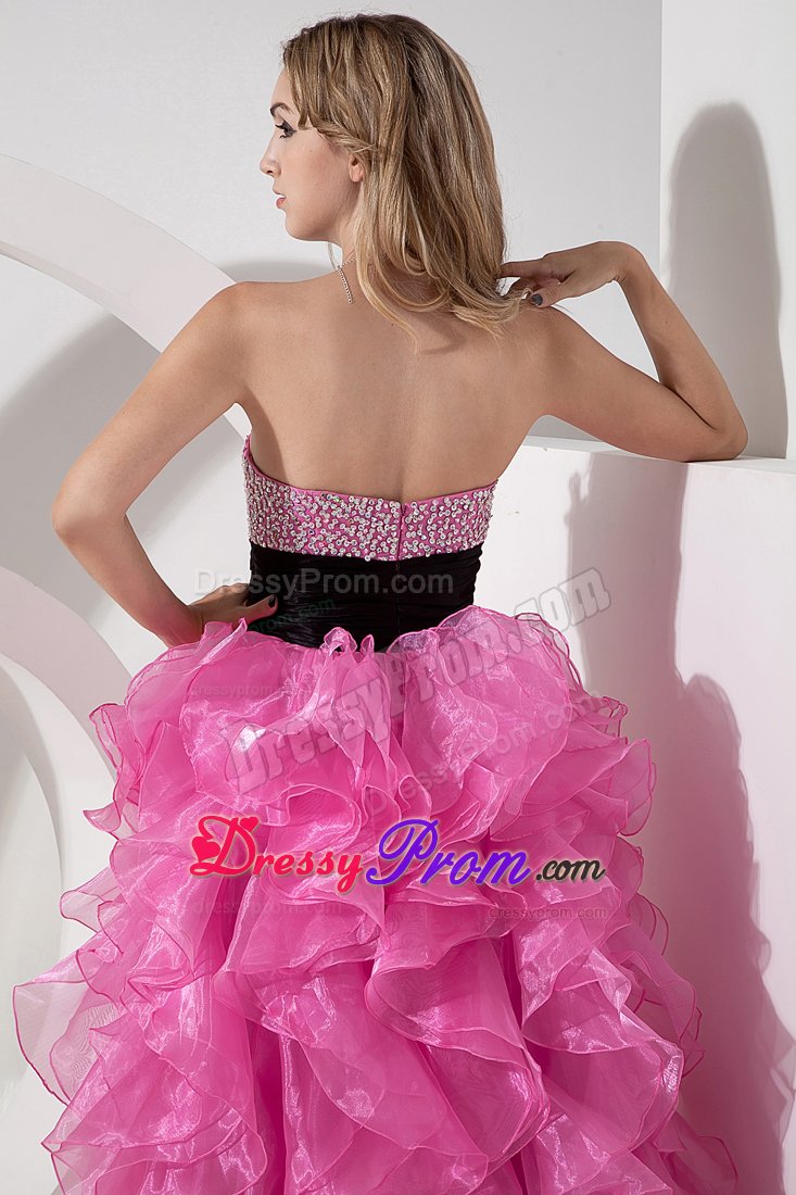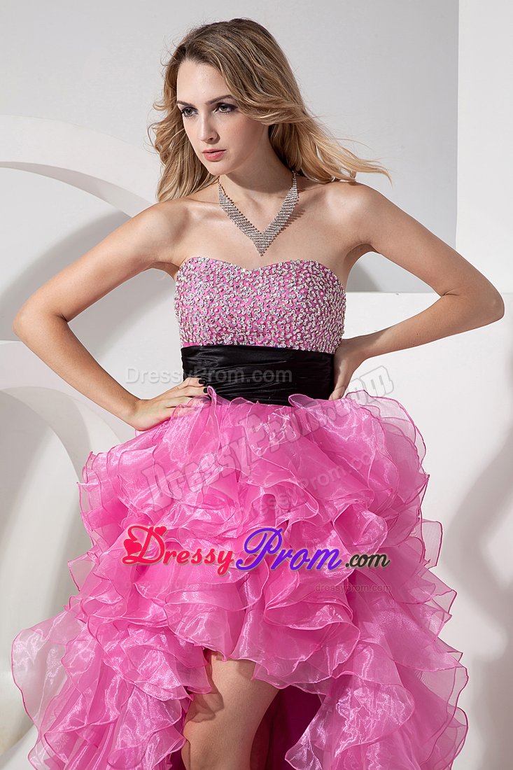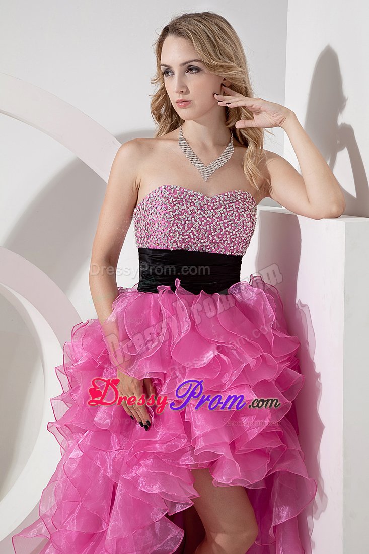 You`ll love the youthful style of this strapless cocktail dress. Brightly sparkling, multicolored beaded accents crowd along dress its form-fitting bodice, which features a gently curved neckline. A ruched belt fits closely at the waist. The fantastic skirt has a high-low silhouette made up of cascading ruffles. A hidden zipper makes for easy off and on and secures the dress in place. Silhouette: A-line / Princess