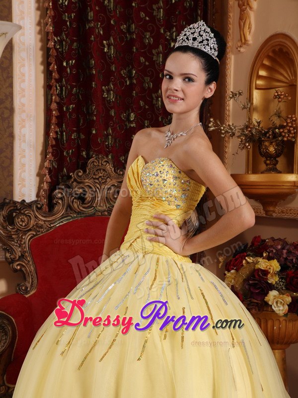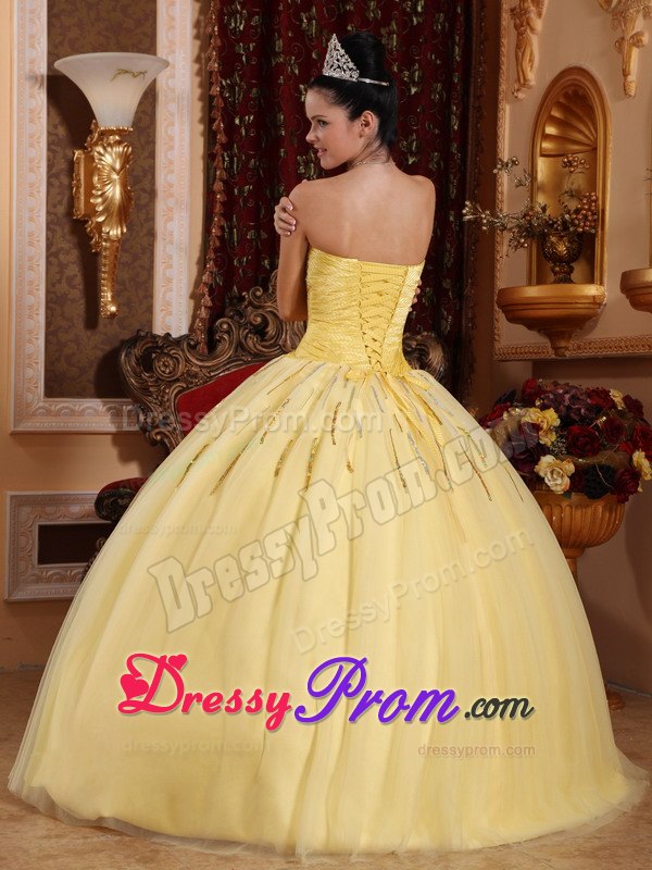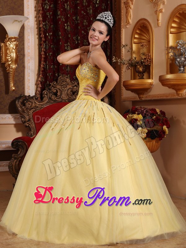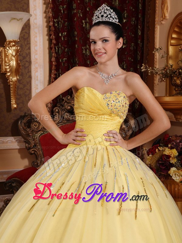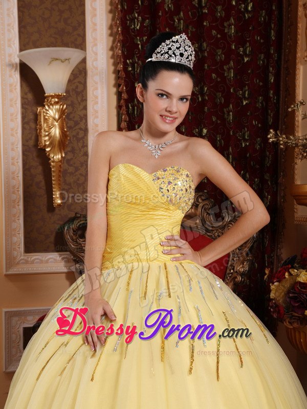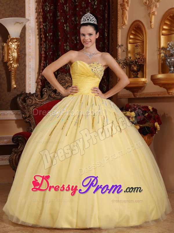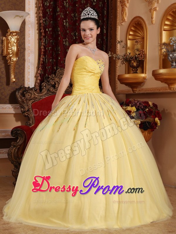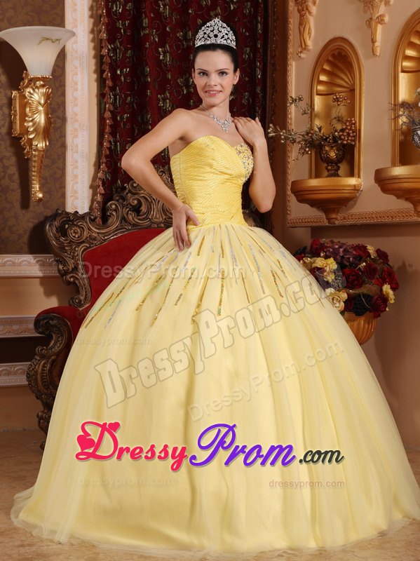 This amazing yellow quinceanera dress will have you feeling and looking like royalty. It features a one strap bodice that's embellished with pleats.The puffy skirt is long and flowing and pools in a lovely puddle at your feet. The simple, yet intricate designs in this gown will surely make it a favorite.