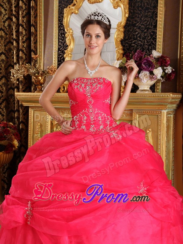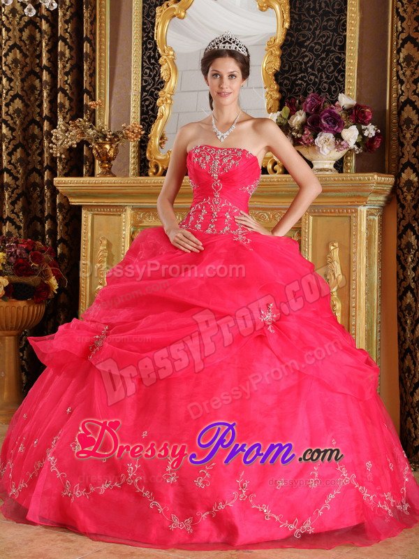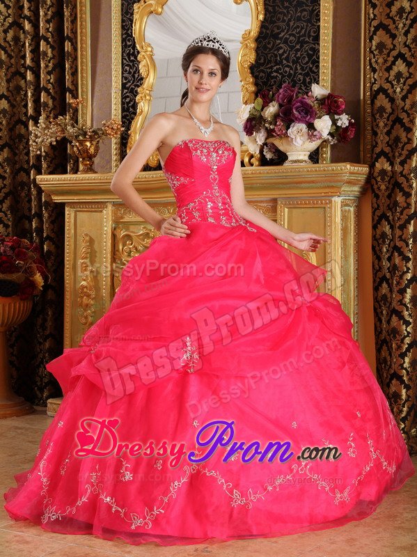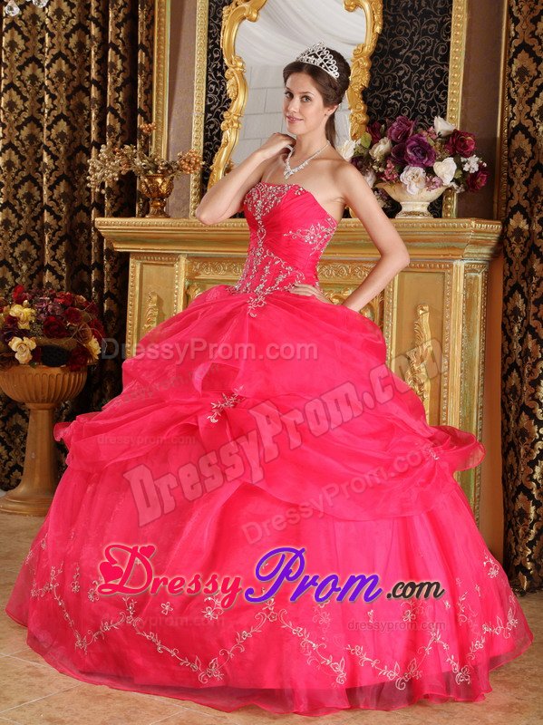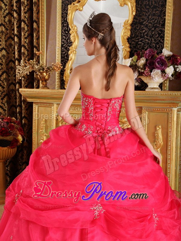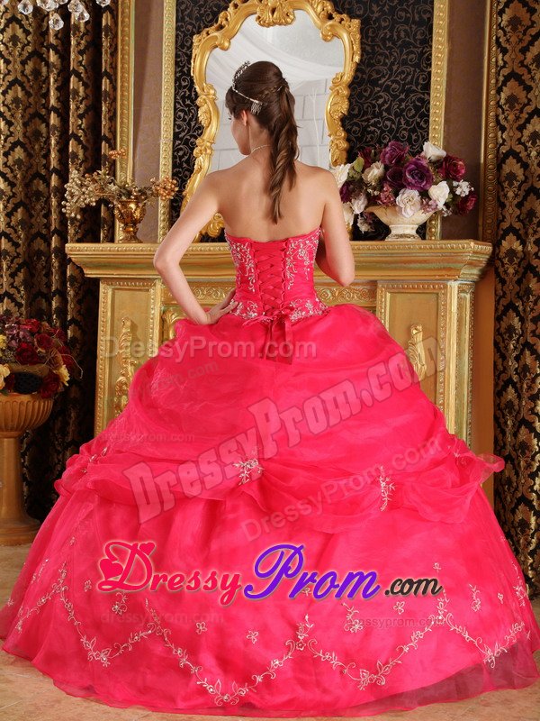 The red color will never be out of date. This red elegant quinceanera dress features a sweetheart neckline with bodice heavily embellished with embroidery and beadings and specialized by cross shape ruchings. The A-line skirt with some pick ups and hem which is full of embroidery completes the wonderful silhouette.
