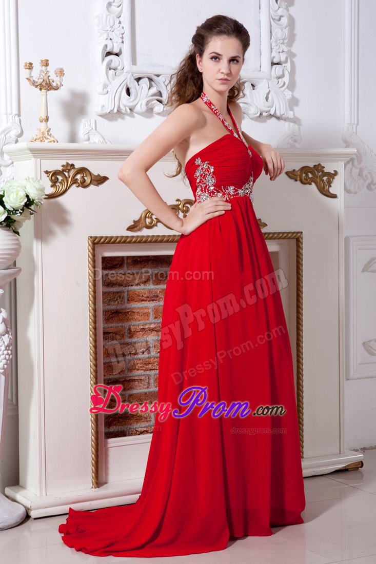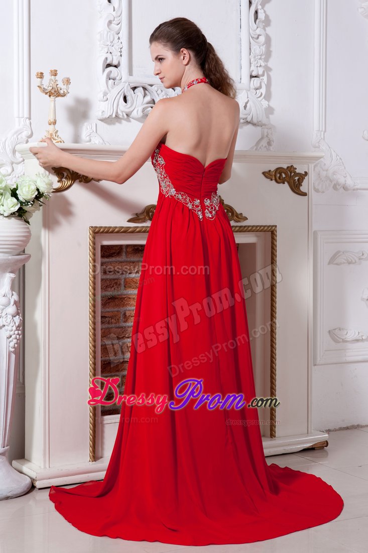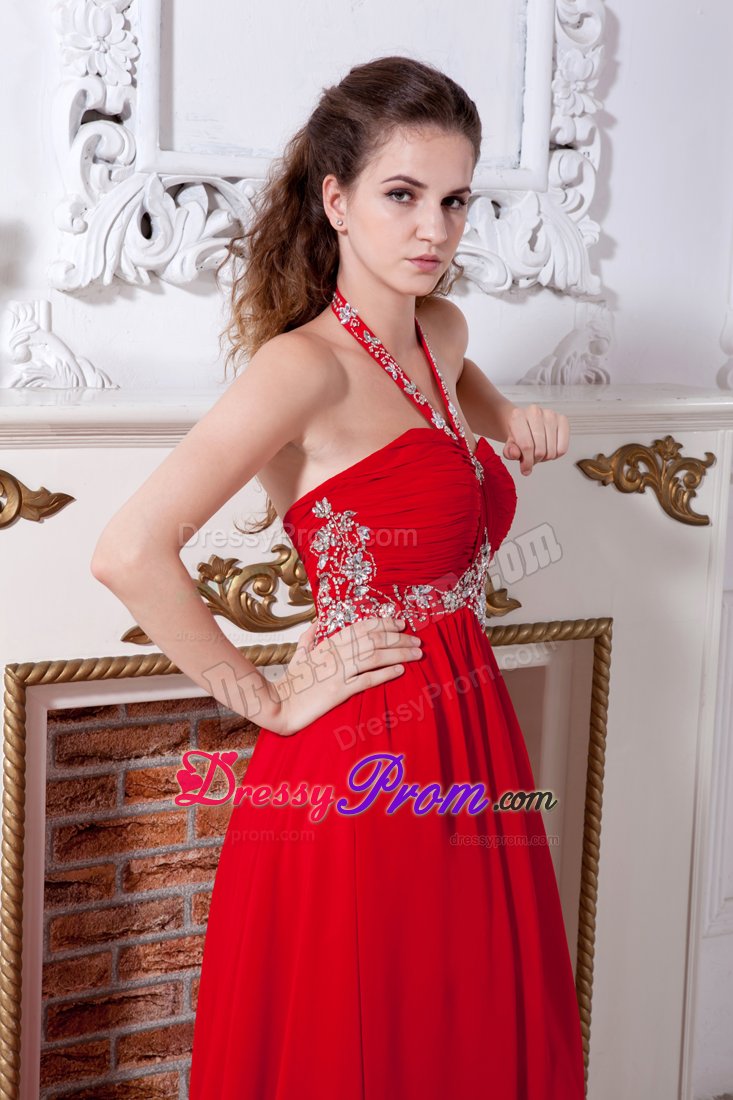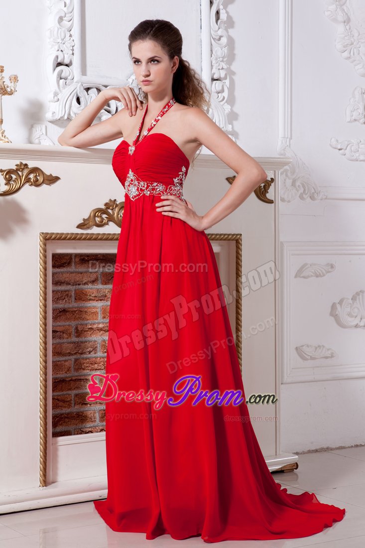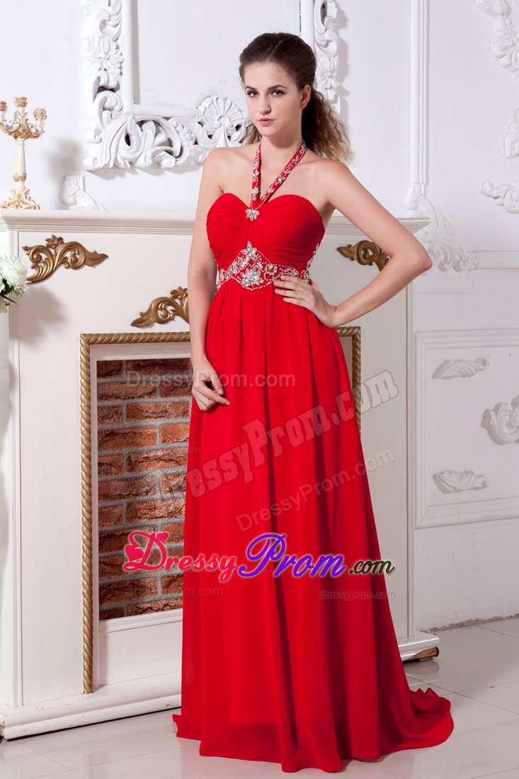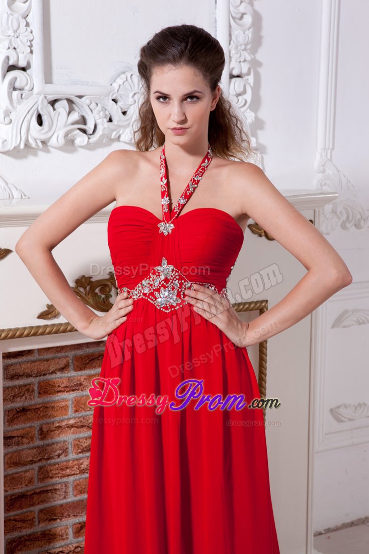 Bandage style dresses are very popular figure flattering designs. This one wraps your body in gorgeous chiffon until just past the hips. It has a tantalizing halter top that is trimmed with sparkling crystals. BIgger and smaller beadings both on the waist that contour the waistline beautifully. The A-line skirt with naturally flowing pleats sweeps the floor creating a lovely silhouette. This is one of those clean and classic designs that never goes out of style.