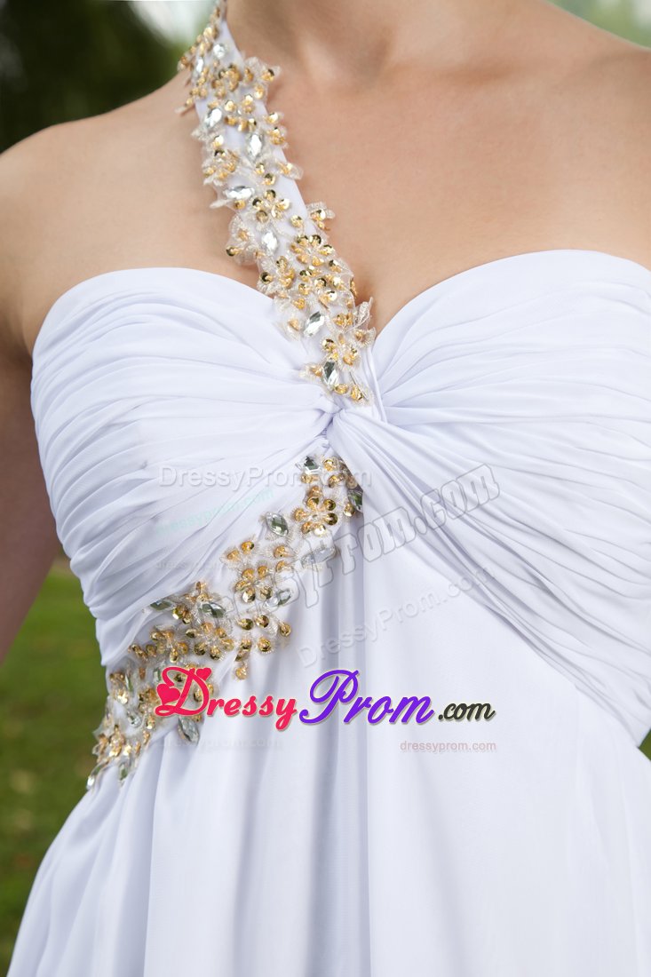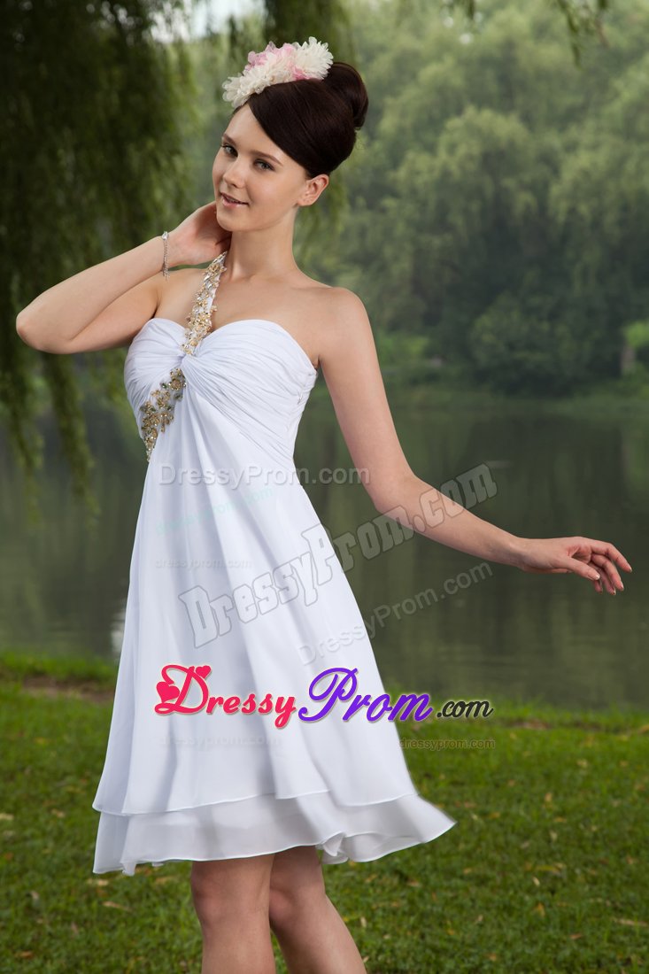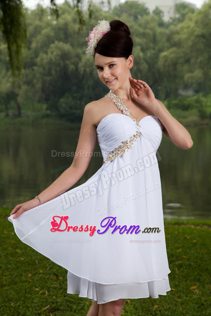 Gorgeous is the only word to describe this dress. It's made in a traditional sheath style with a one shoulder bodice and sweetheart neckline. The one strap is embellished with intricate beading and crosses the front and back of the body on one side, it twists and blends with the other fabric in the back left a shaped exposed back, sexy but not too revealing. The skirt falls in clean lines to the knee in two layers. A great example of simplistic elegance.