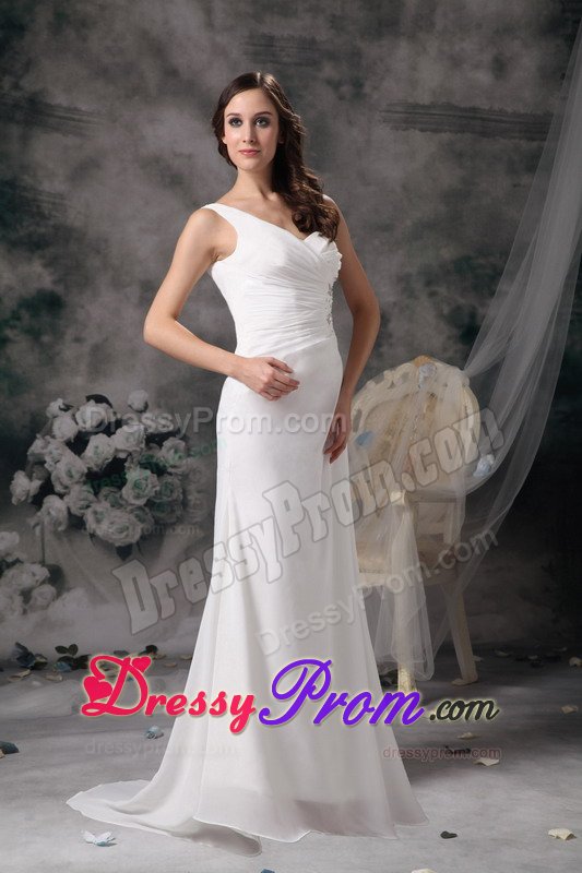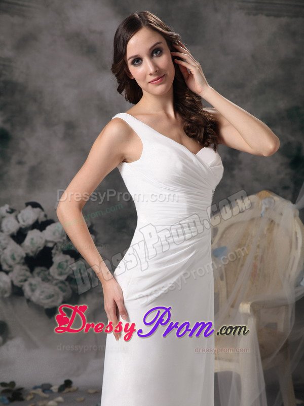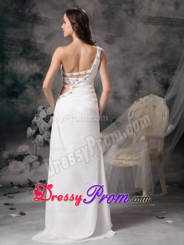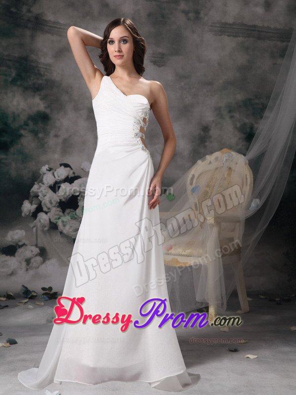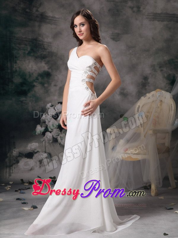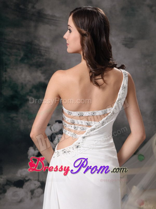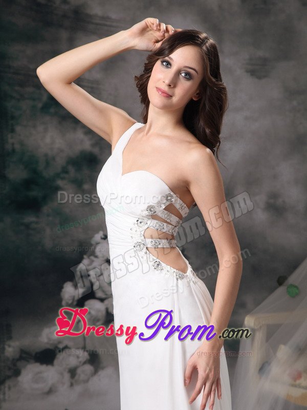 This one shoulder soft and romantic white prom dress is slightly ruched in the bodice. The most catching part is the left bodice, which was made by four belts and was decorated with beading. Take a look at the back, it contours your curve perfectly. Wear this dress and you surely will be a shining star in your party.